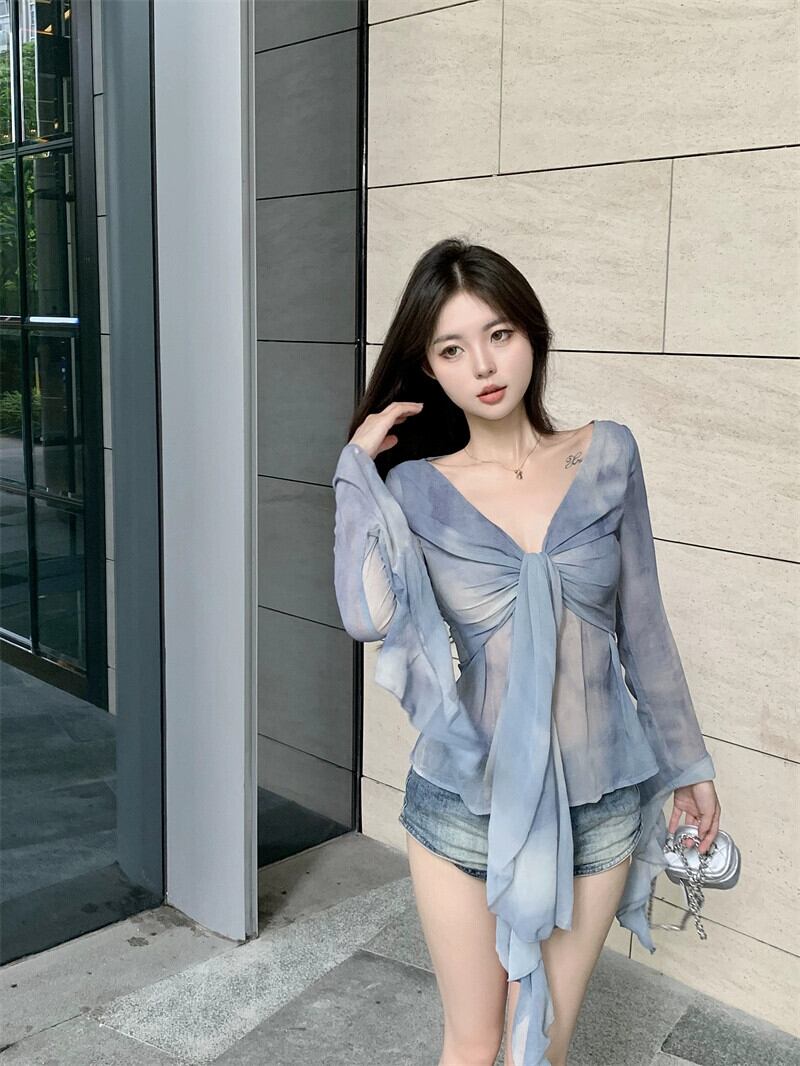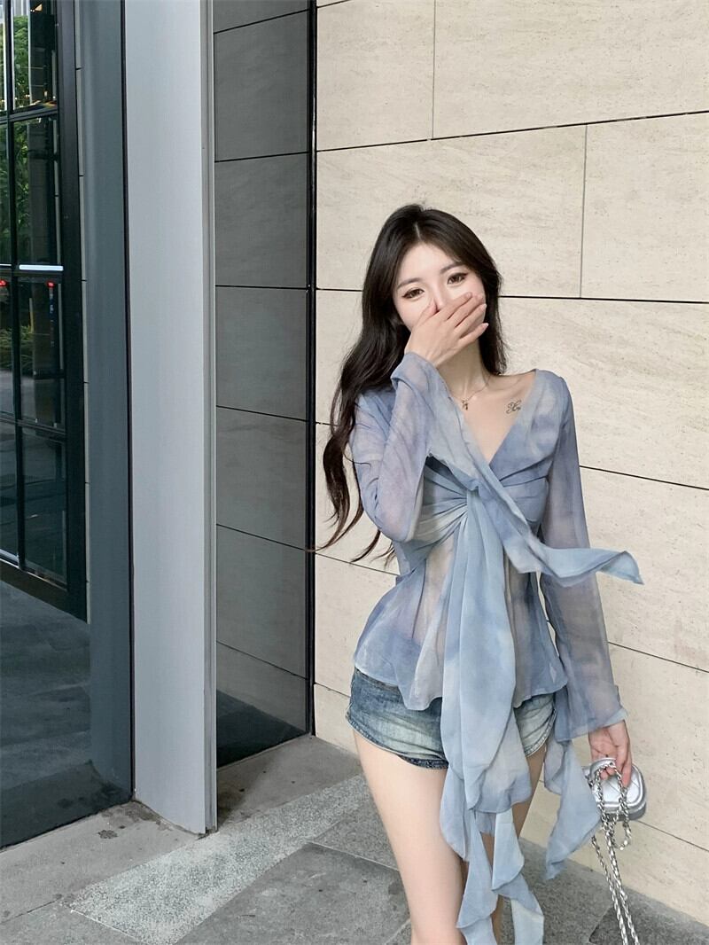初秋の青い V ネック絞り染め長袖シャツの女性、純粋な光沢のあるスタイル、細いスタイル、ユニークなウエストのデザイン、ニッチなトップ ロング ブルー オータム 秋物 Vネック ピュア bstraw16765380342 | beaute25