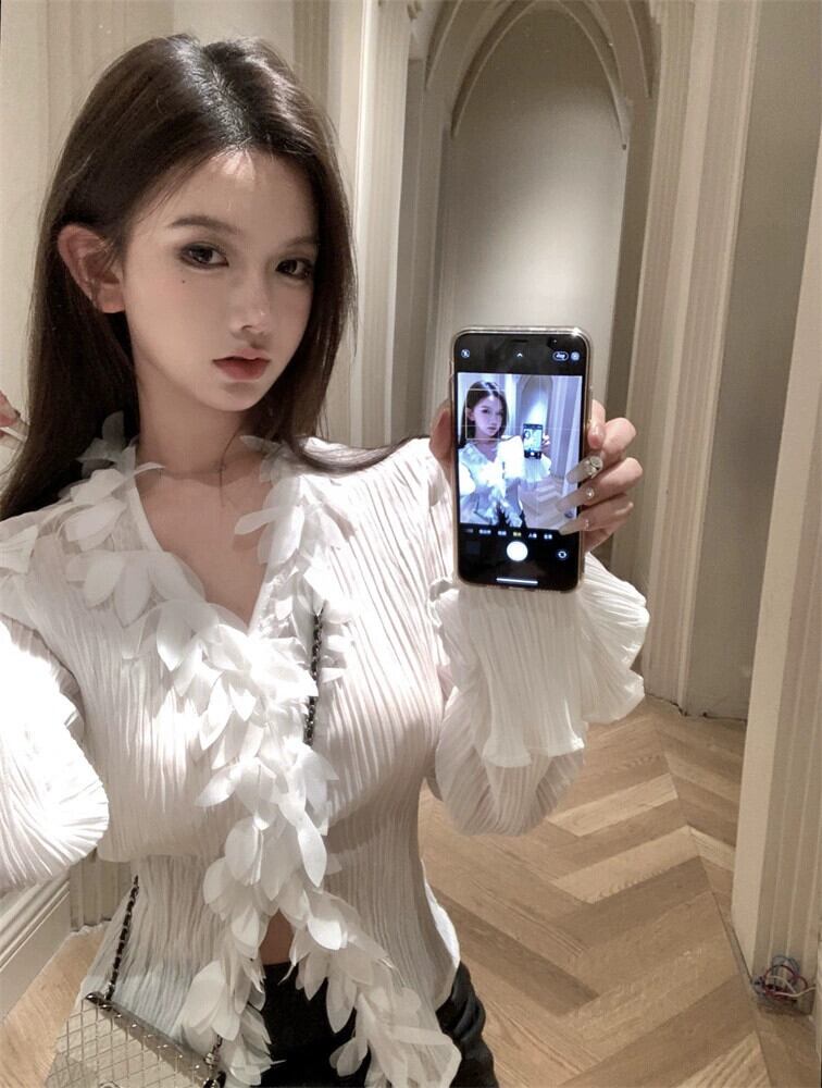 フレンチ V ネック立体フラワーシャツ女性秋スリムフィットウエスト長袖シャツデザインニッチシックトップ ロング オータム 秋物 Vネック フラワーデザイン bstraw42846407191 | beaute25