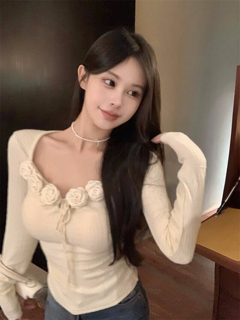 センスニッチ立体フラワーTシャツレディース初秋スリムフィットショートフロントショルダー長袖ボトムスクエアカラートップス ロング オータム 秋物 フラワーデザイン スクウェア bstraw31798567498 | beaute25