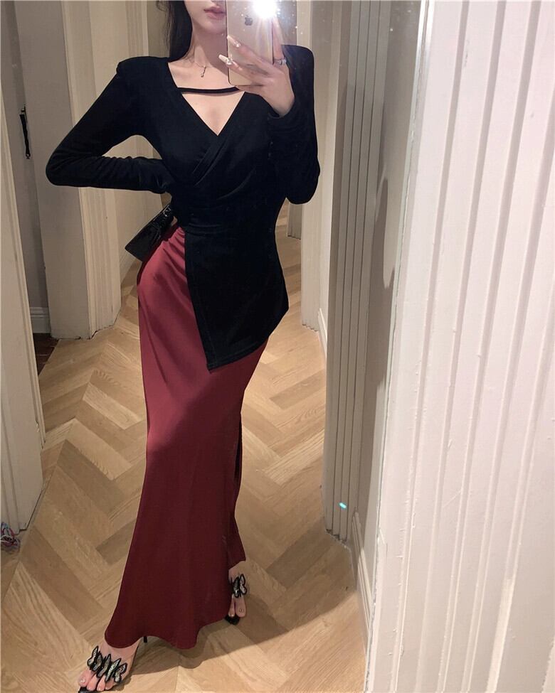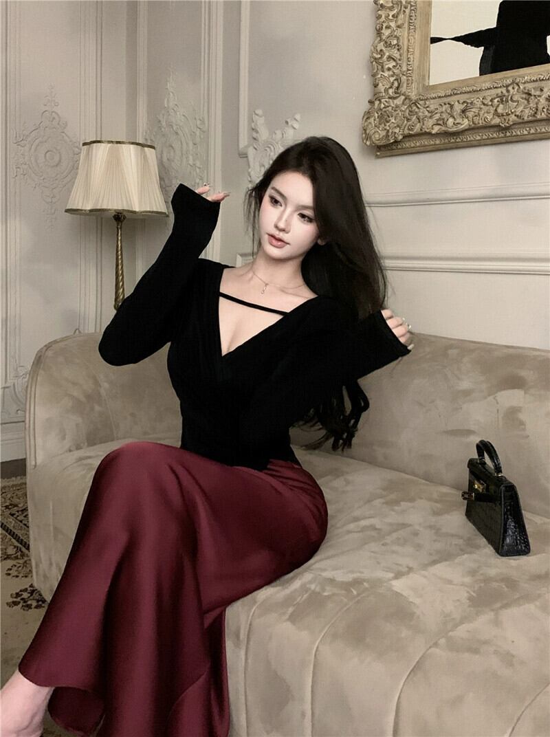 レトロ純粋な欲望スタイルハイコールドロイヤルシスター V ネック長袖 Tシャツ女性秋の新不規則なスリット黒スリムフィットトップ ロング ブラック オータム 秋物 Vネック ピュア bstraw99744384148 | beaute25
