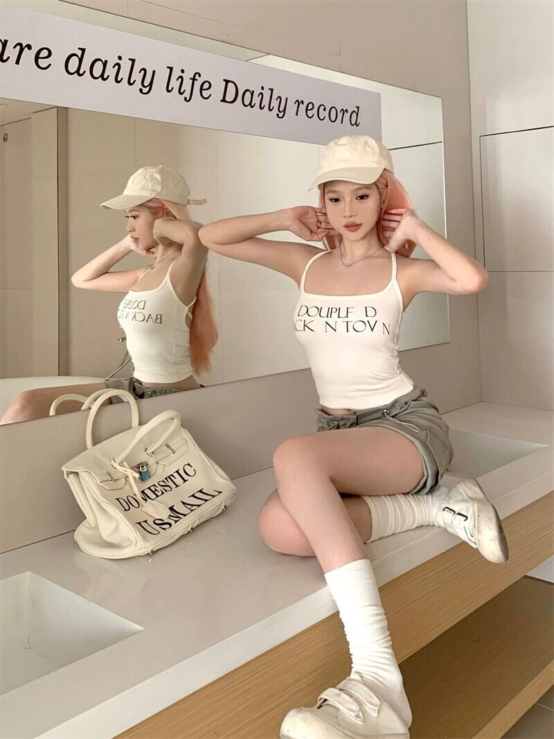 アメリカのレトロなレタープリントキャミソールベスト女性夏ヨーロッパとアメリカのセクシーなバックレスノースリーブショートトップアウターウェア サマー 夏物 ヨーロピアン bstraw33774350465 | beaute25