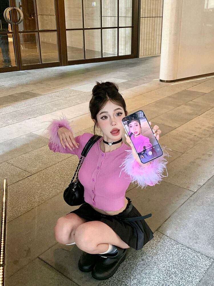 ピンクの毛皮のようなスプライシング長袖ニットカーディガン女性秋 2023 新しい甘いスリムショートボトムトップ ロング 大人ガーリー スウィート キュート カジュアル オータム 秋物 bstraw75884708886 | beaute25