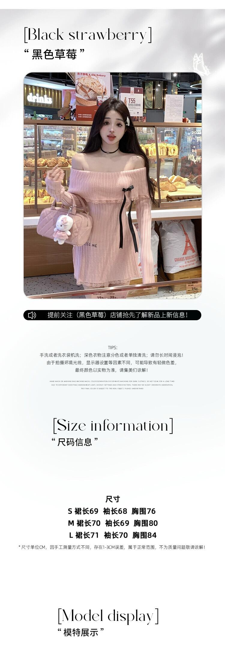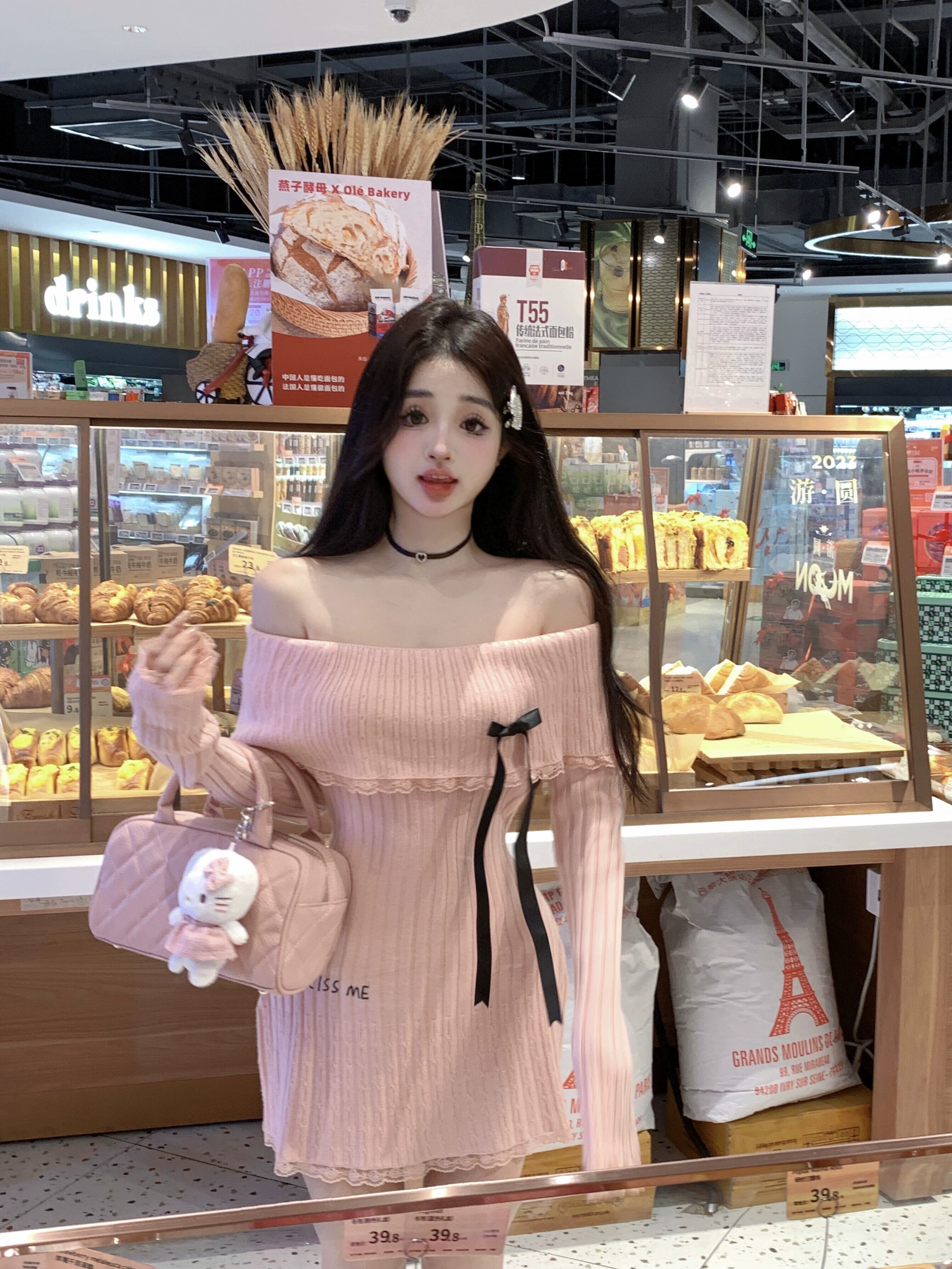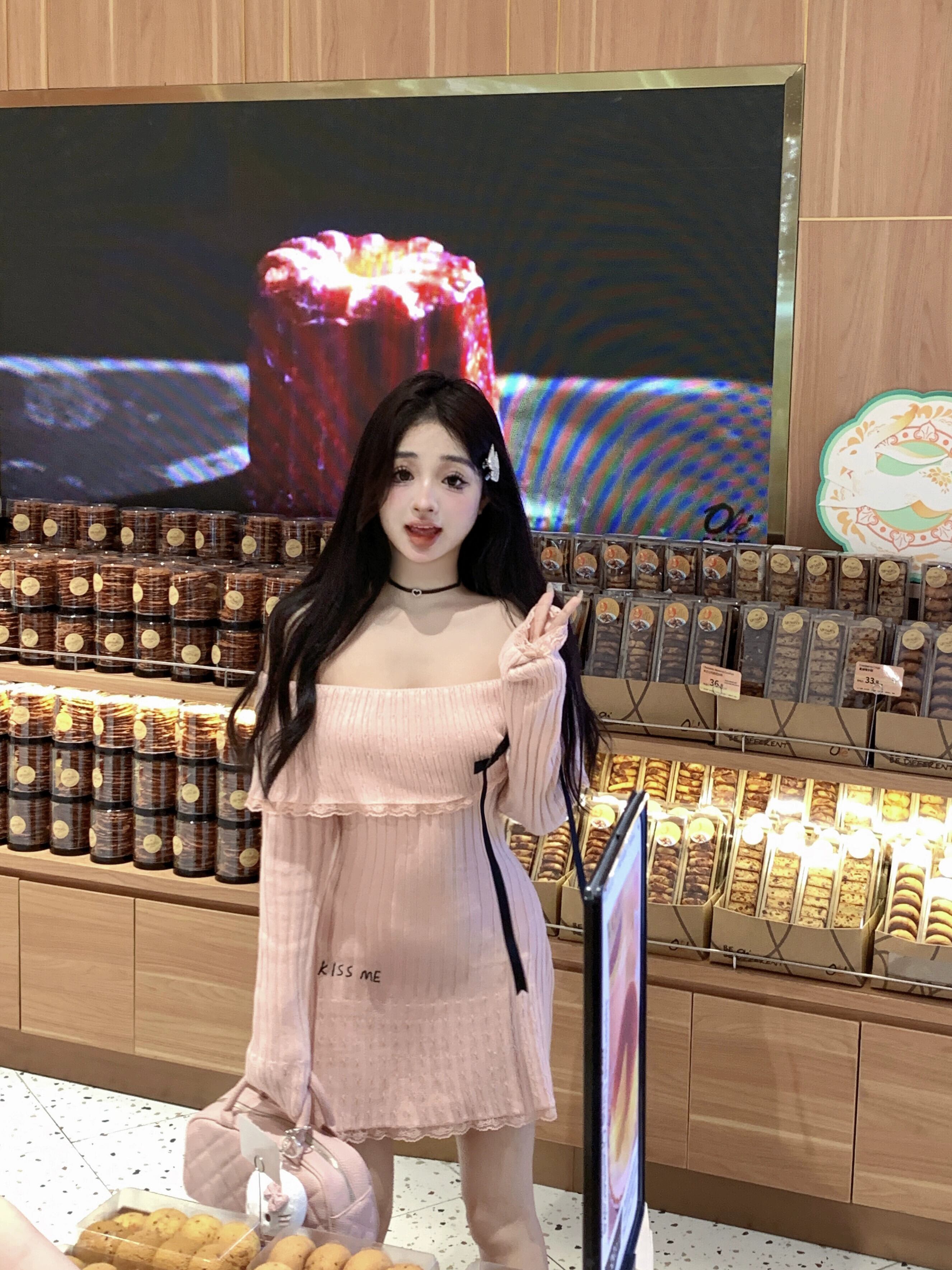 セクシーなワンショルダー長袖ニットドレス女性秋の純粋な光沢のあるピンクのスカートとウエストレースのaラインスカート ロング オータム 秋物 ピュア bstraw79583845899 | beaute25