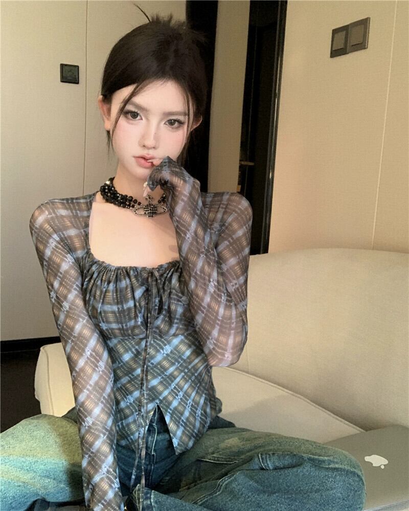レトロな対照的な格子縞のメッシュ Tシャツ女性初秋長袖日焼け防止スリムスクエアネックタイトな甘いショートトップ ロング 大人ガーリー スウィート キュート カジュアル オータム 秋物 スクウェア bstraw28867359402 | beaute25