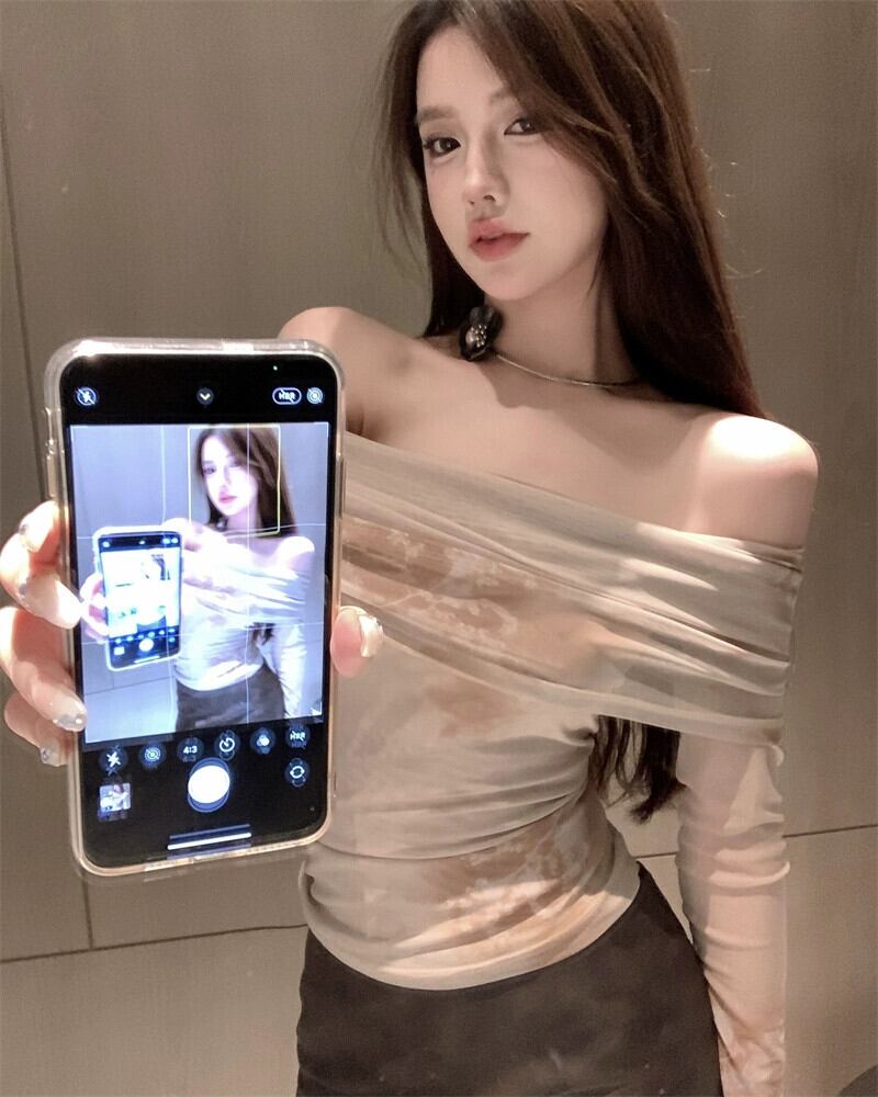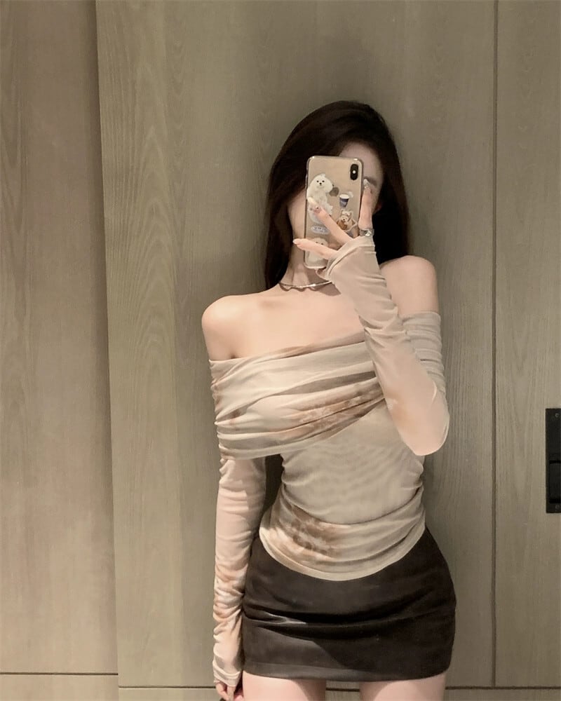 ワンショルダー プリント メッシュ T シャツ レディース 秋 スリム デザイン ニッチ オフショルダー 長袖 日焼け止め トップ ロング オータム 秋物 Tシャツ bstraw91525428568 | beaute25