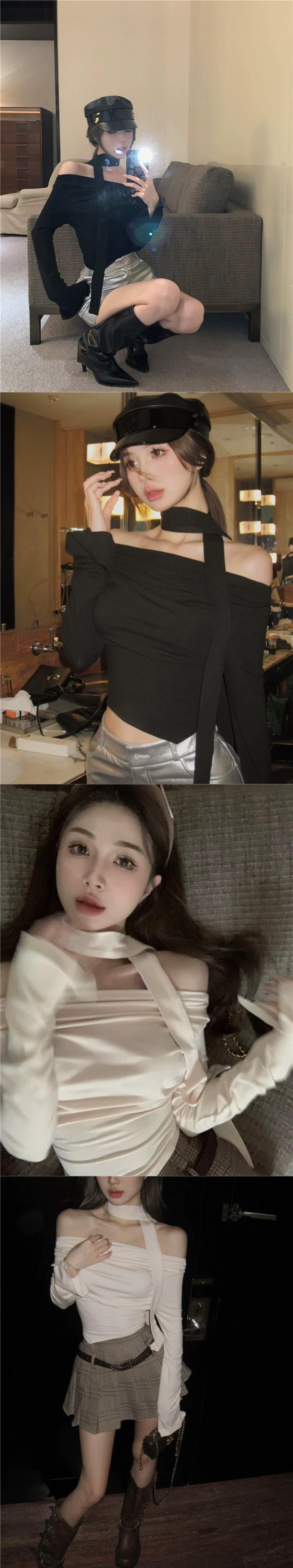 黒のワンショルダー長袖 Tシャツの女性の秋の純粋な欲望のセクシーなオフショルダースリムショート不規則なボトリングシャツトップ ロング ブラック オータム 秋物 ピュア bstraw2540387763 | beaute25