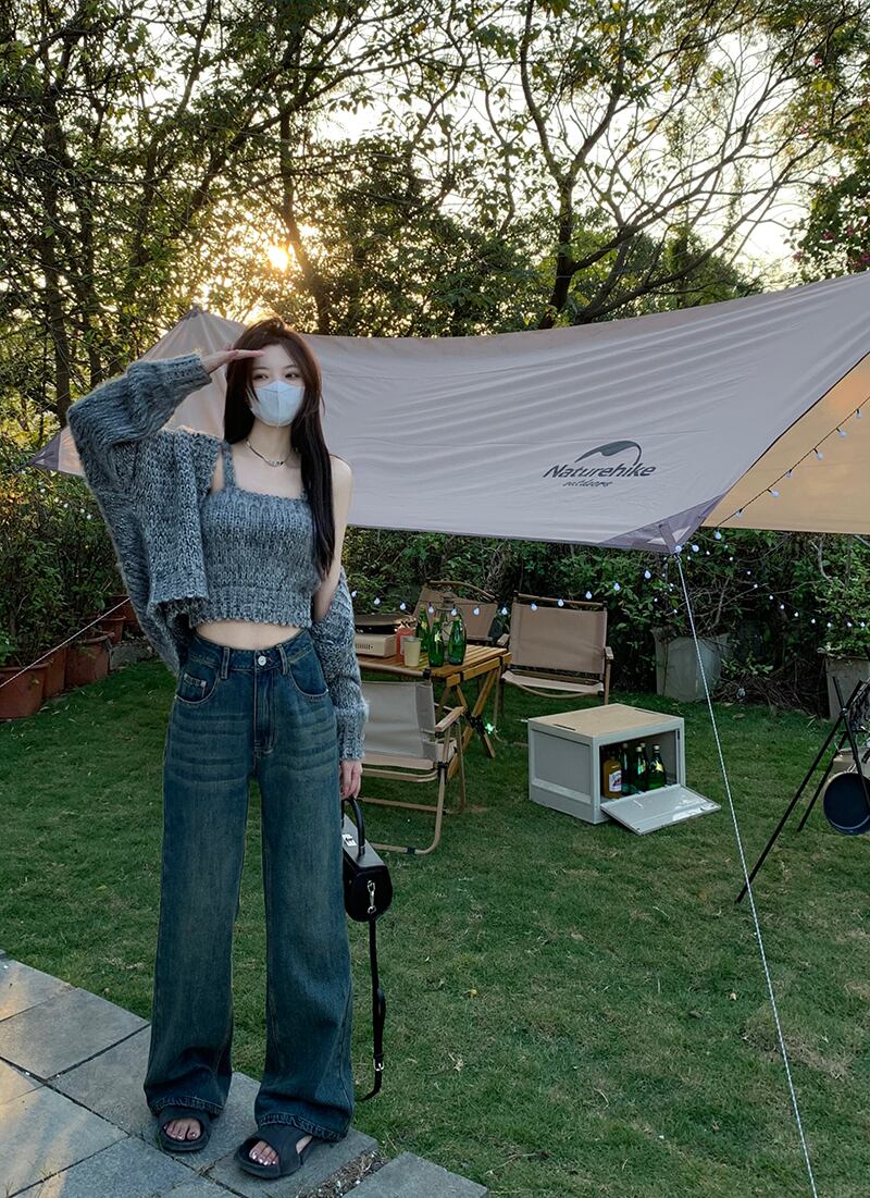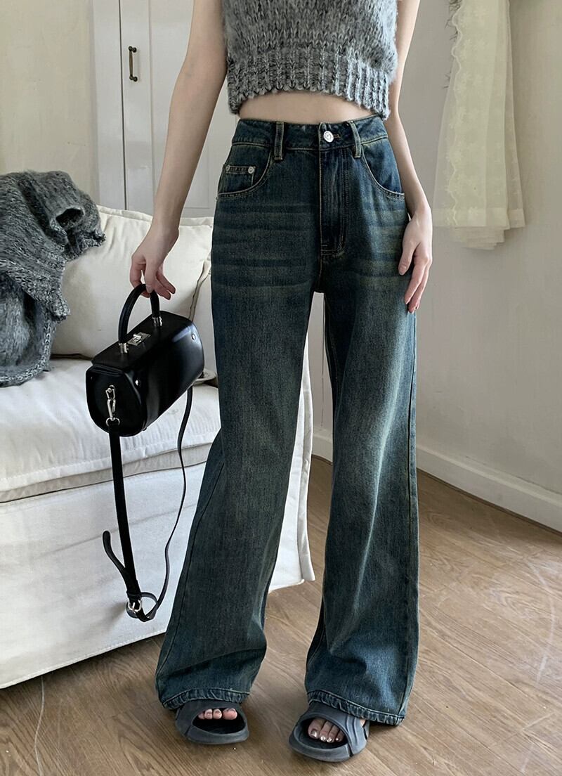 レトロなダメージブルージーンズのレディース、秋のハイウエストワイドレッグパンツ、ゆったりとした汎用性の高いストレートレッグフロアレングスパンツ オータム 秋物 bstraw16892123418 | beaute25