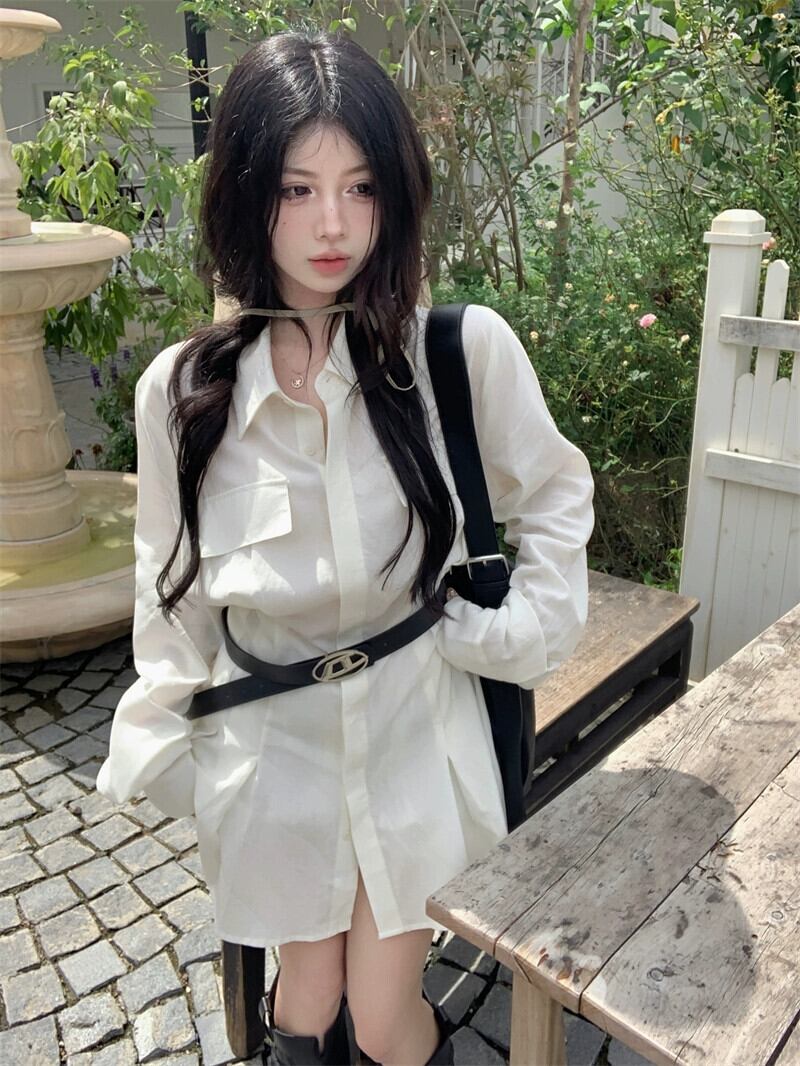 白いポロカラーシャツ、長袖ワンピースの女性、秋、小さい、純粋、、ウエストを絞ったショートスカート、着痩せスカート ロング ホワイト オータム 秋物 bstraw25591339689 | beaute25