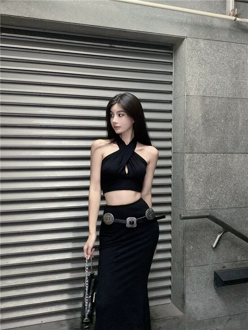 黒のホルターネックベストの女性の夏のセクシーなネクタイスーツ A ラインヒップカバーミッドレングスのフィッシュテールスカート 2 点セット ブラック サマー 夏物 Aライン bstraw14062365446 | beaute25