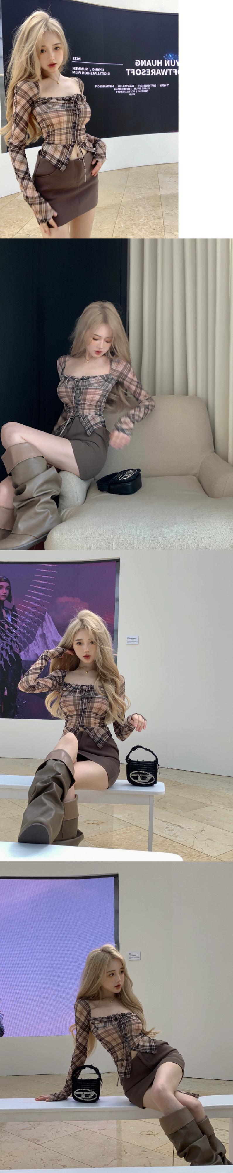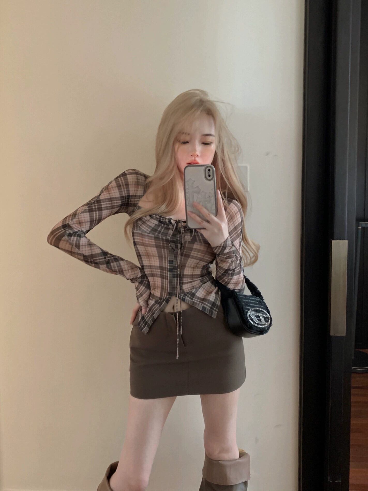 ホットガールスクエアネックチェック柄シャツ女性の秋ニッチシャツショートスリムフィットストラップ長袖日焼け止めトップ ロング オータム 秋物 スクウェア bstraw91235390187 | beaute25