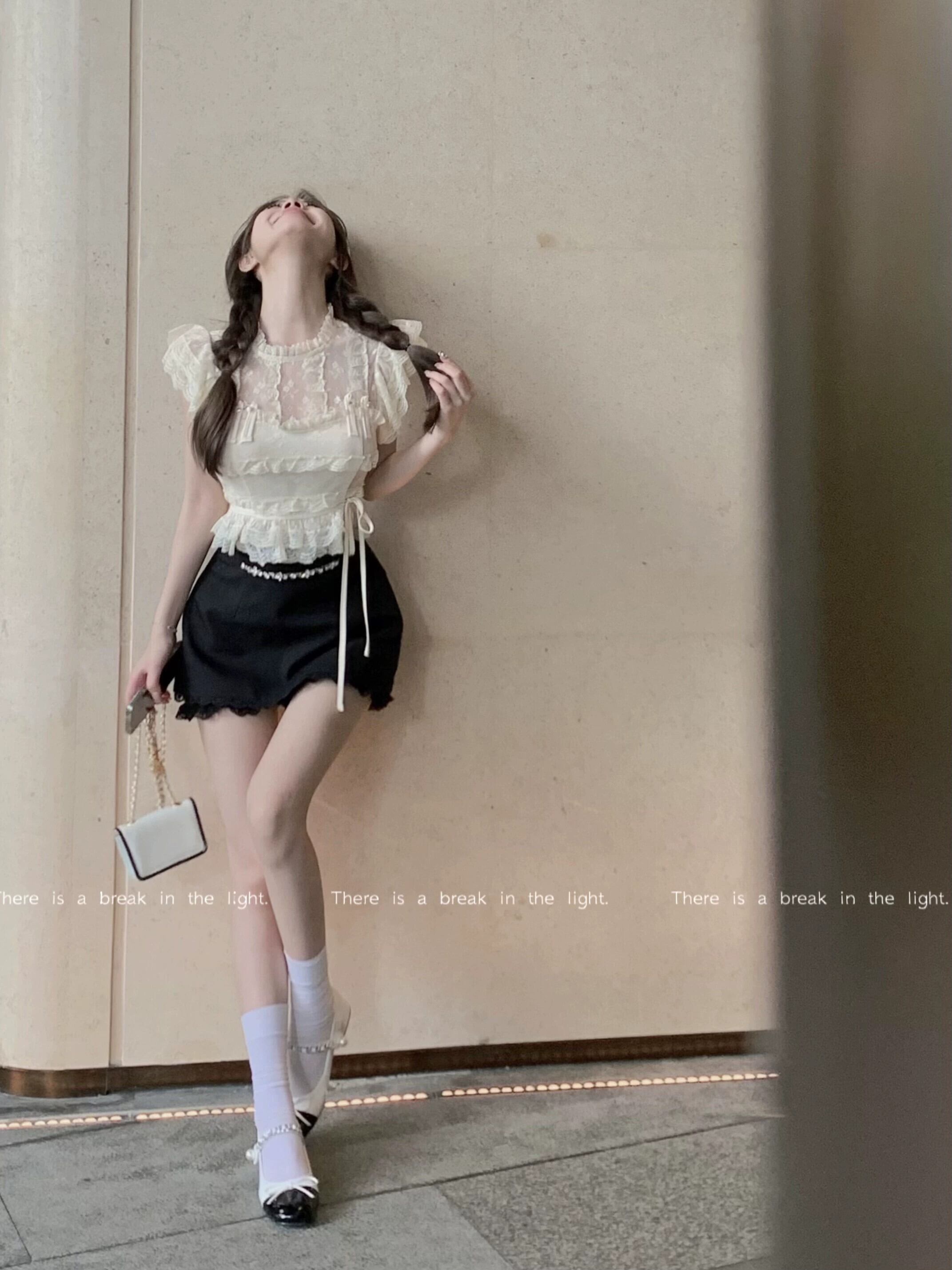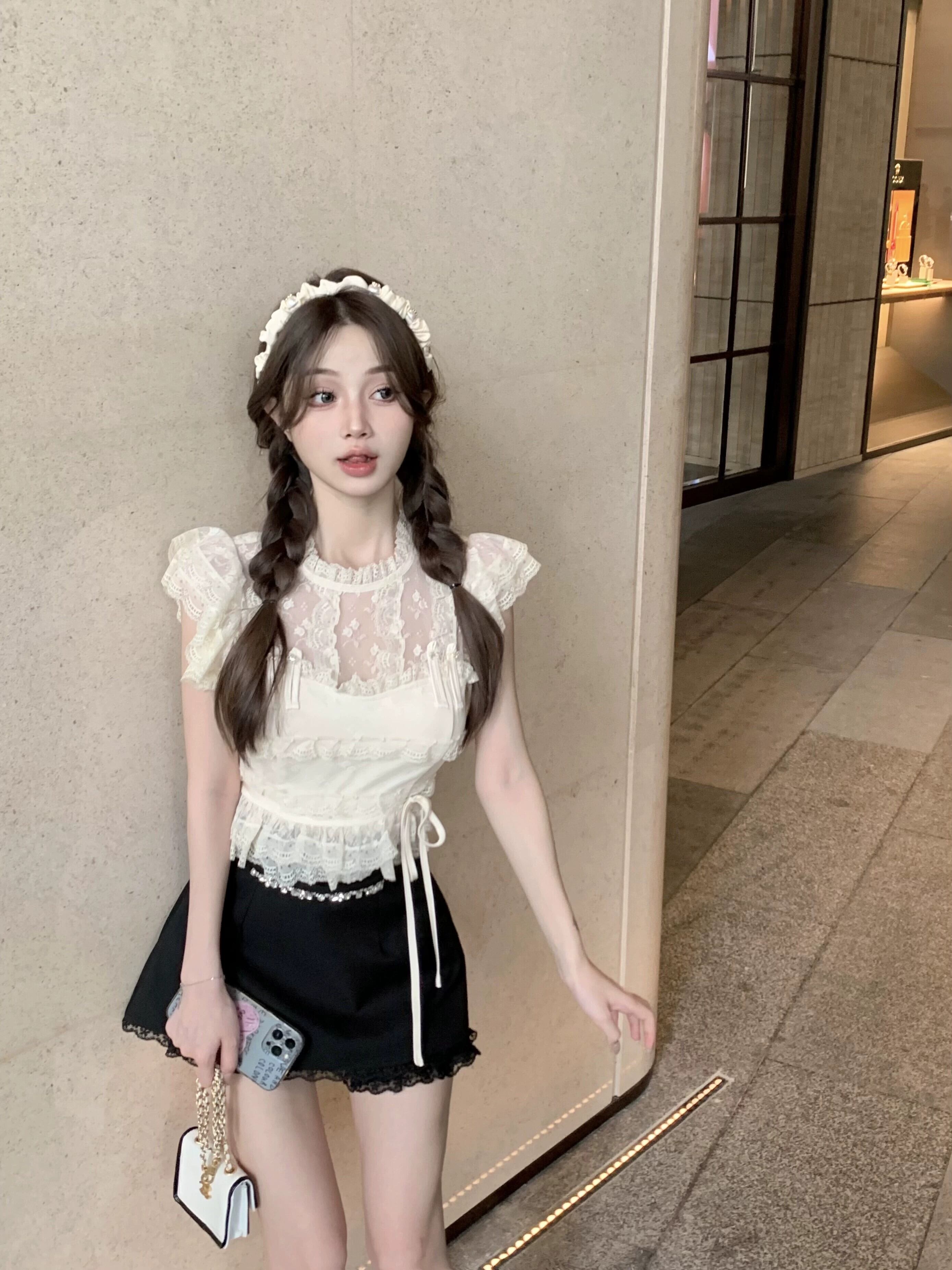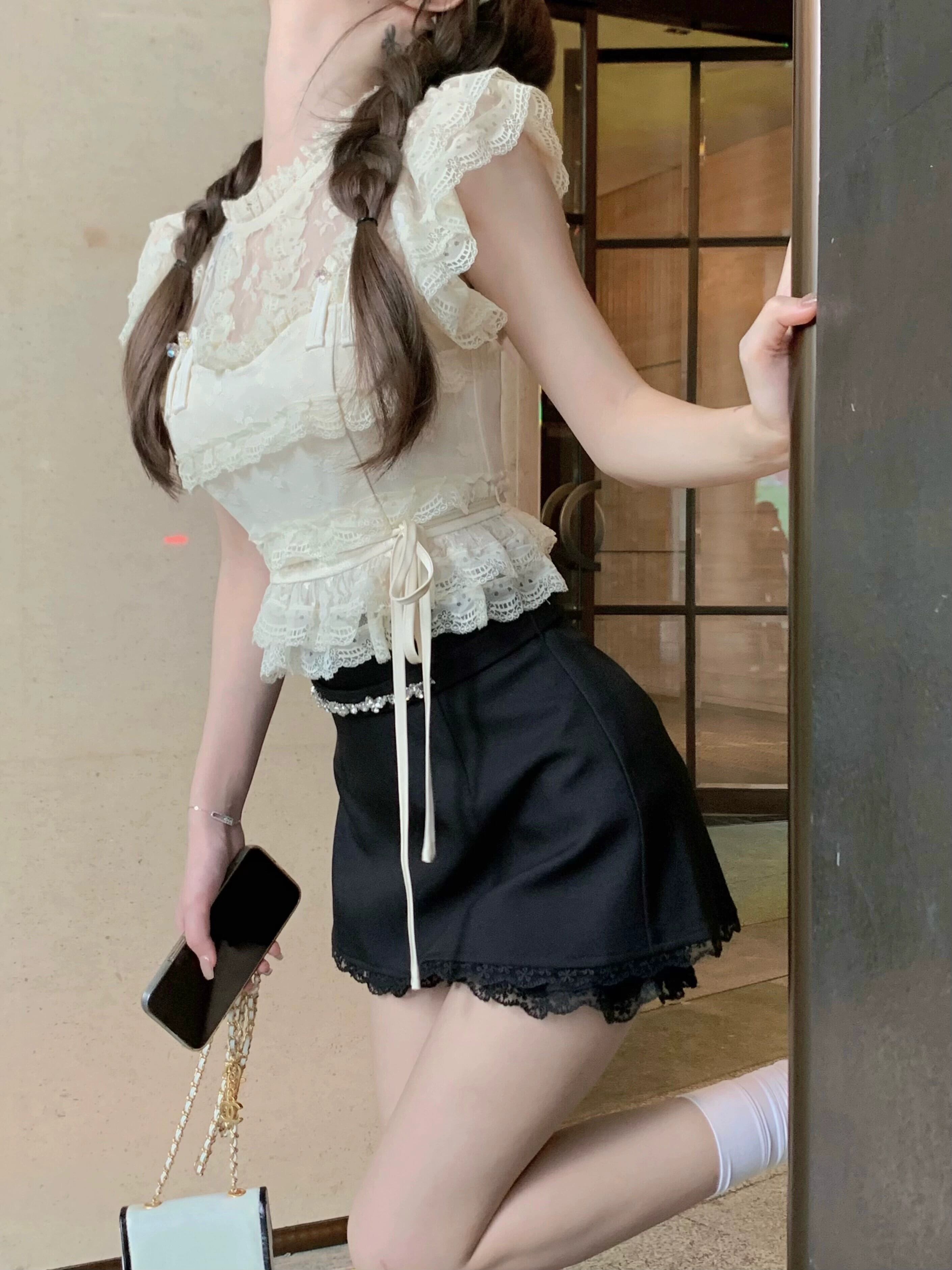 純粋な欲望甘いボタン付きレースアップ小さなフライング スリーブ シャツ女性の夏ヘビーデューティ レース シャツスリム ショート シック トップ 大人ガーリー スウィート キュート カジュアル サマー 夏物 bstraw37703443843 | beaute25