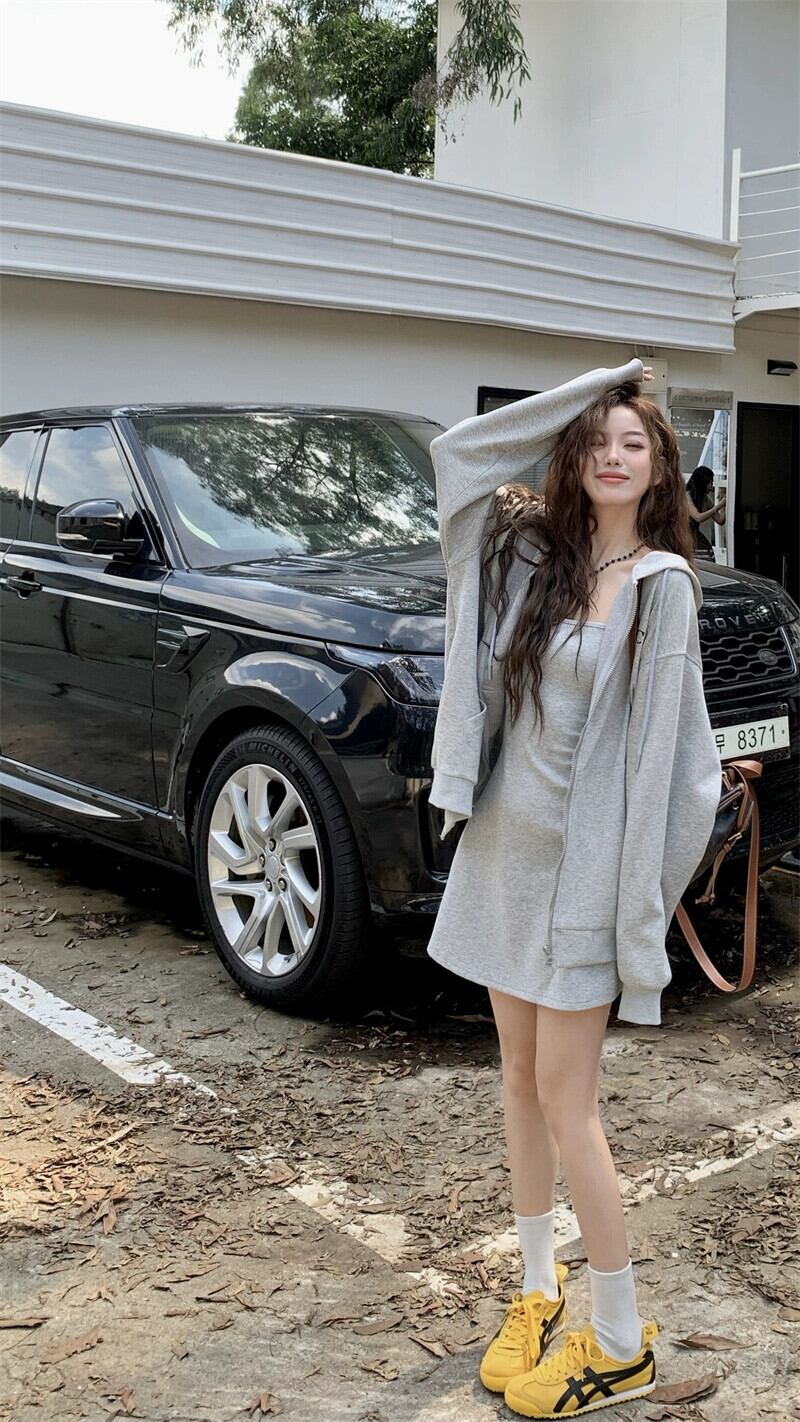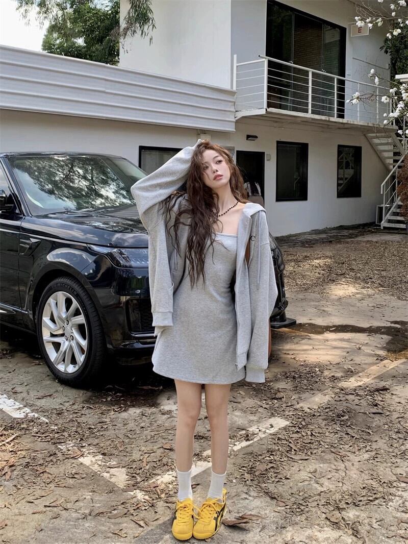 グレースーツスタイルルーズ長袖フード付きスウェットシャツジャケットレディース秋サスペンダードレスショートスカート2点セット ロング オータム 秋物 bstraw71990082818 | beaute25