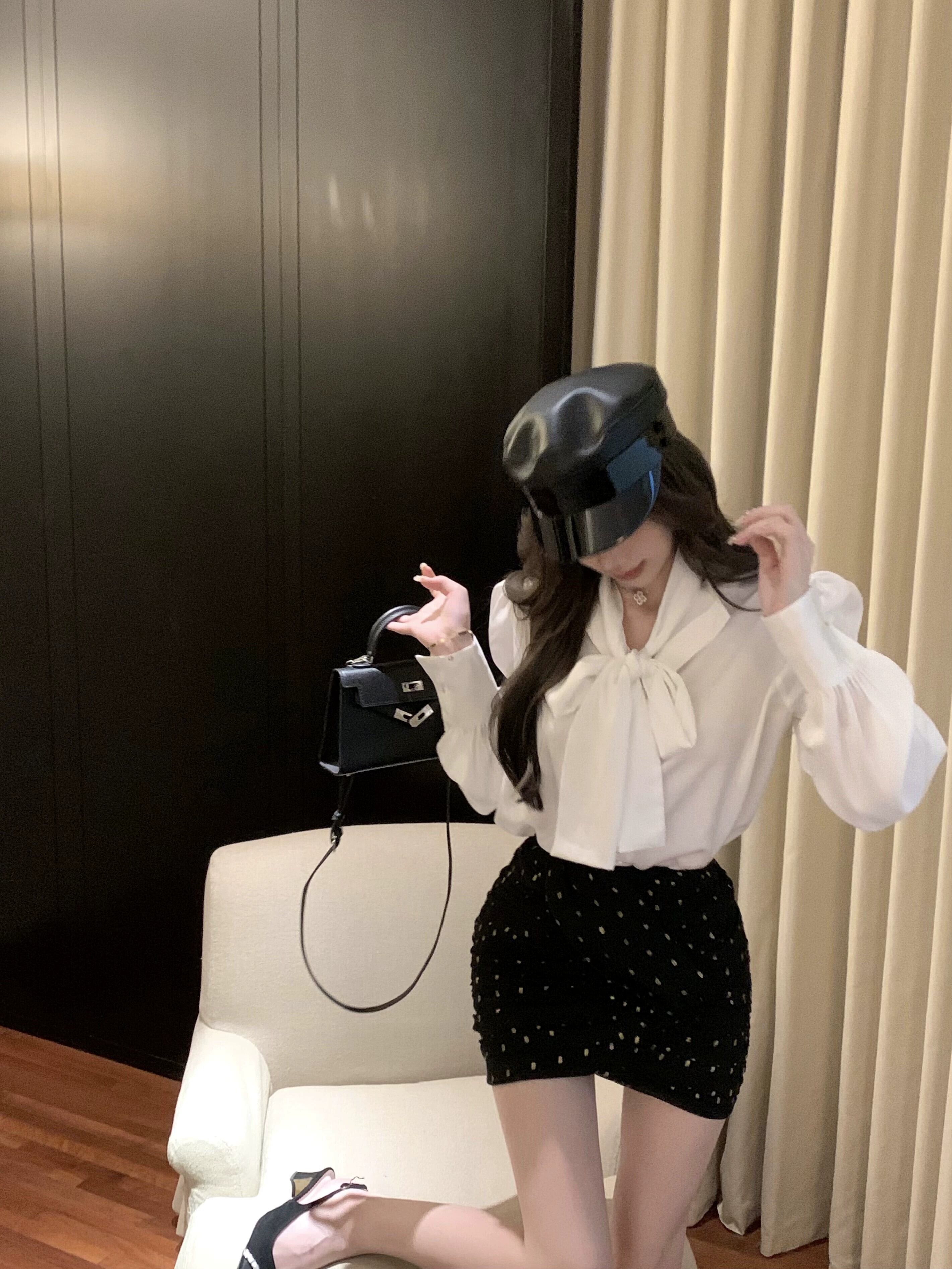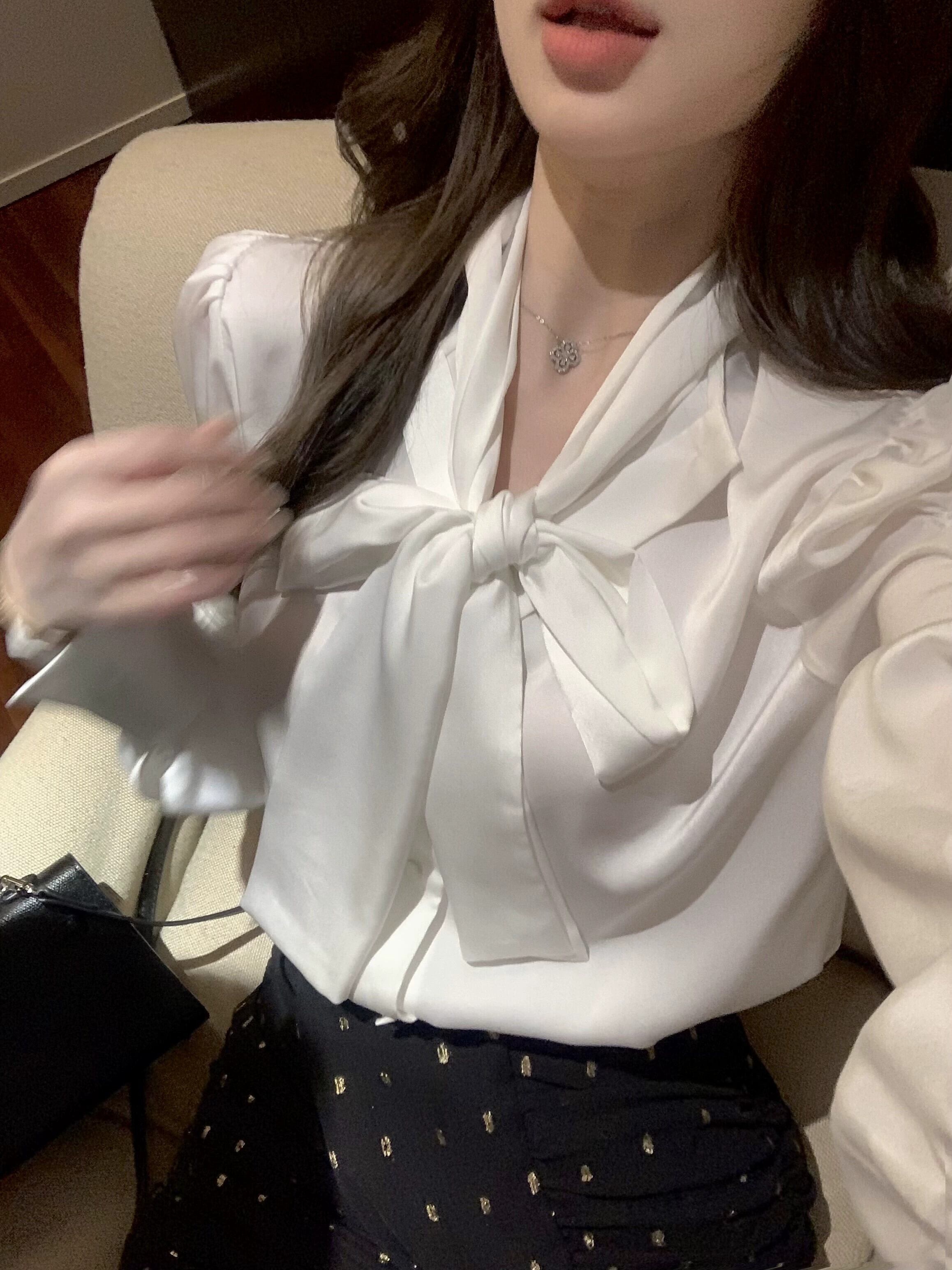 フレンチスタイル V ネック長袖シャツレディース秋リボンアセテートサテンシャツ白パフスリーブトップ ロング ホワイト オータム 秋物 Vネック bstraw65584750235 | beaute25