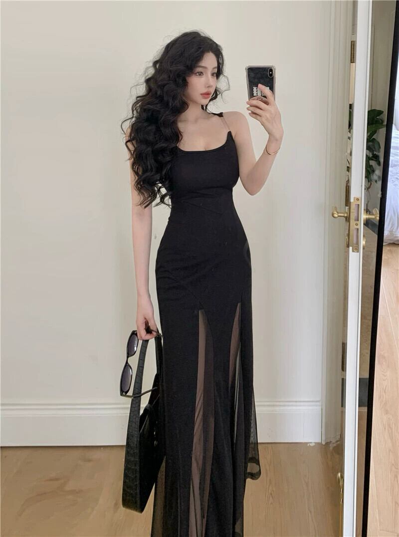 フレンチスタイルの目に見えないショルダーストラップサスペンダードレス女性の夏の黒スカートAライン大きな裾スカートハイエンドメッシュロングスカート ブラック サマー 夏物 bstraw64781078610 | beaute25