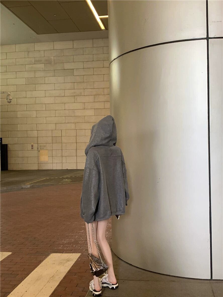 グレー怠惰なスタイルのフード付きスウェットシャツとベルベットのショートジャケット女性の秋 2023 新しいアメリカンレトロジッパートップ オータム 秋物 bstraw49384393790 | beaute25