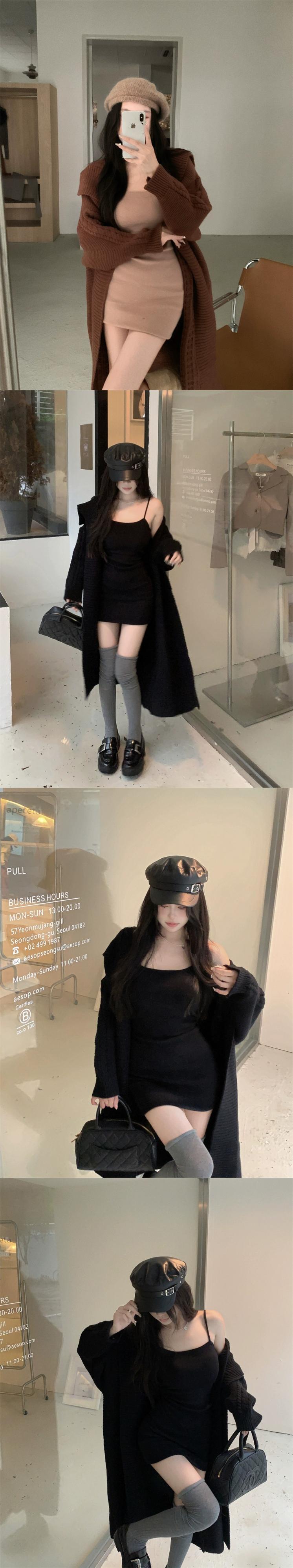 色:コーヒー色のカーディガン,ブラックカーディガン,グレーのカーディガン,グレースリング,コーヒー色のスリング,ブラックサスペンダー
