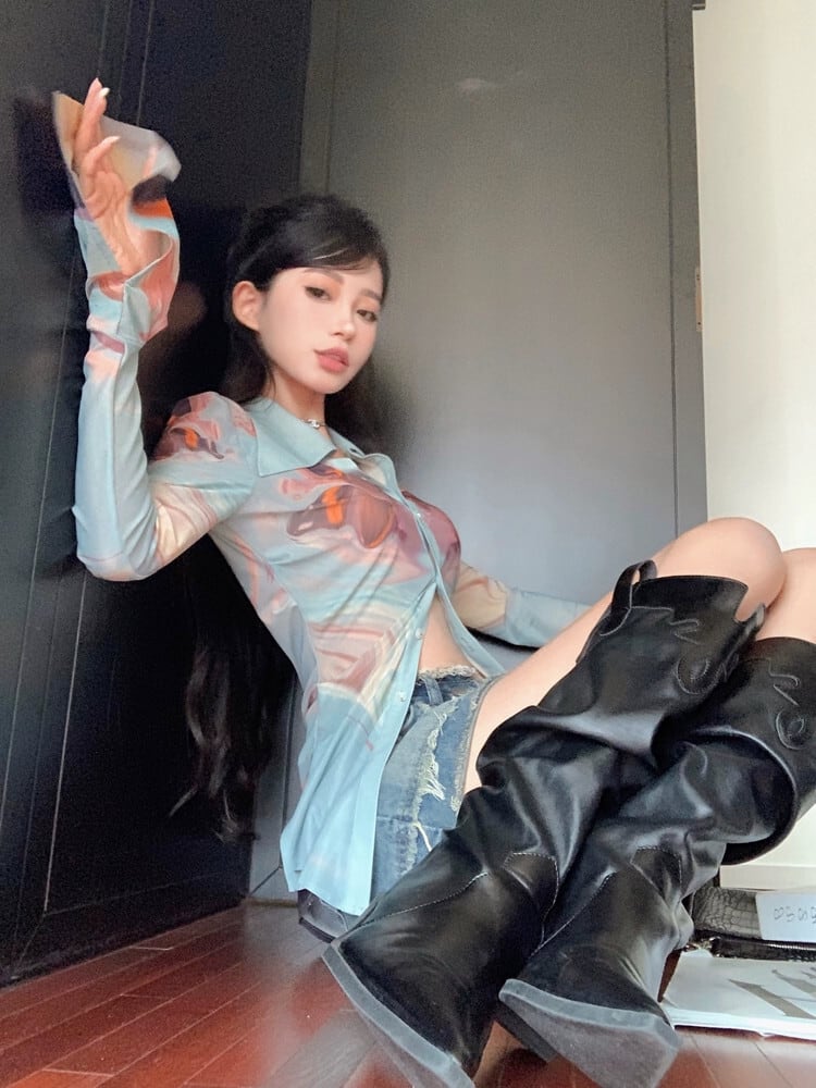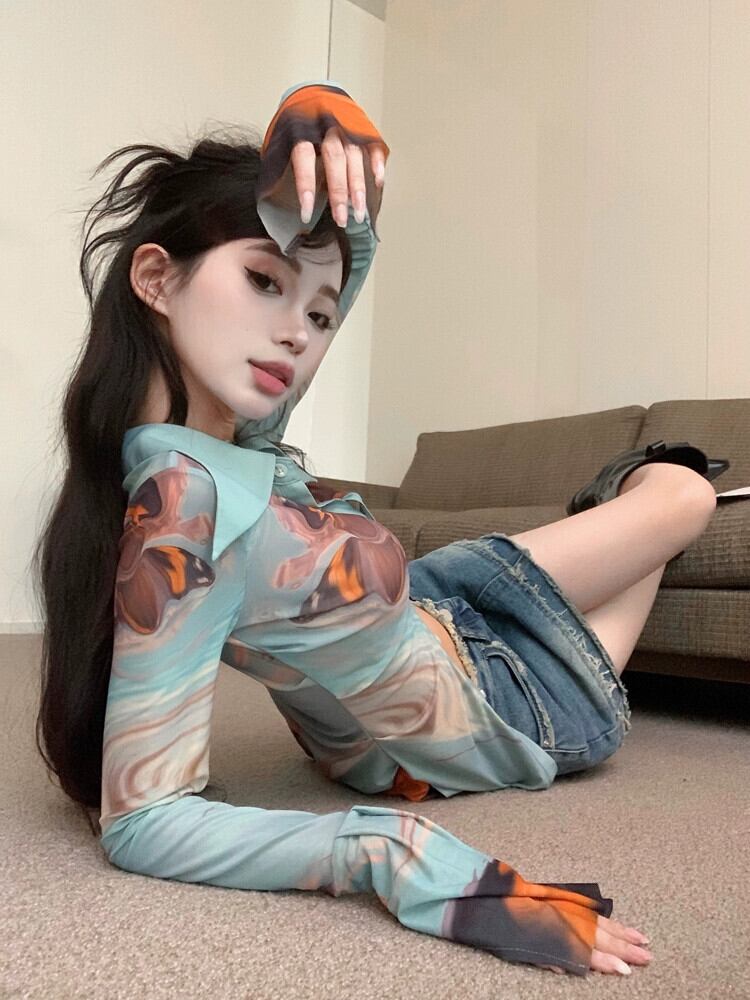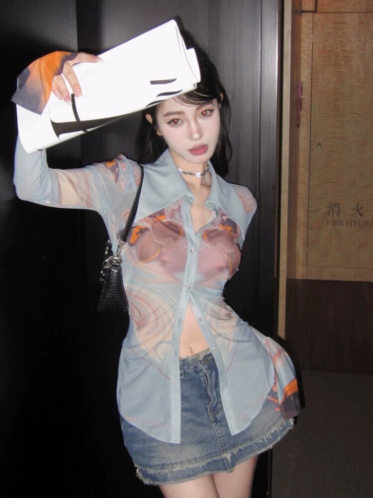 レトロなポロカラー長袖シャツ女性の秋のプリントデザインニッチ弾性ウエストメッシュ日焼け止めトップ ロング エラスティック 伸縮 オータム 秋物 bstraw14325442228 | beaute25
