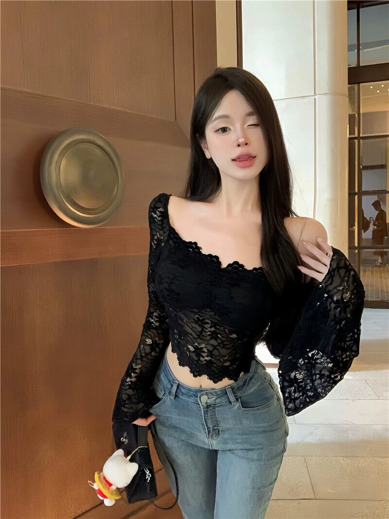 純粋な欲望気質ワンショルダーシャツ女性秋スリムフィットショートオフショルダー長袖レーススプライシングシャツアウタートップ ロング オータム 秋物 bstraw48605454002 | beaute25