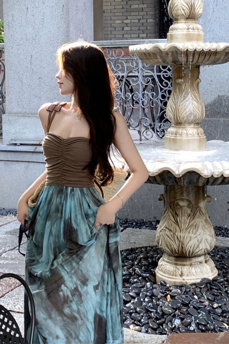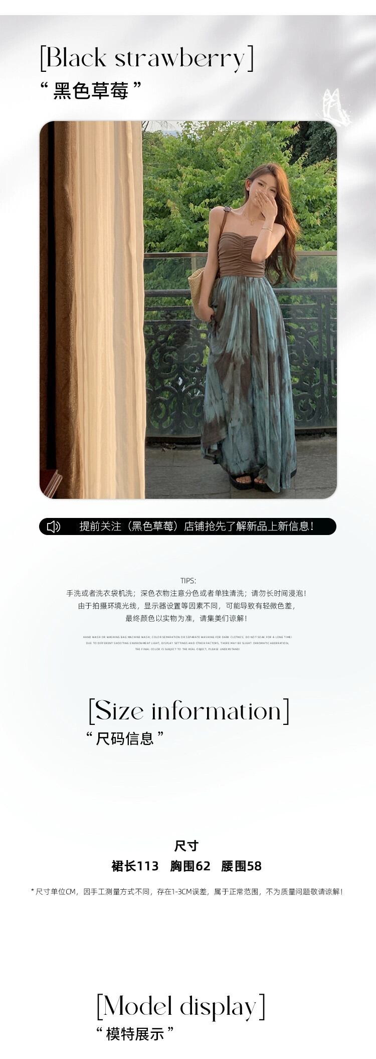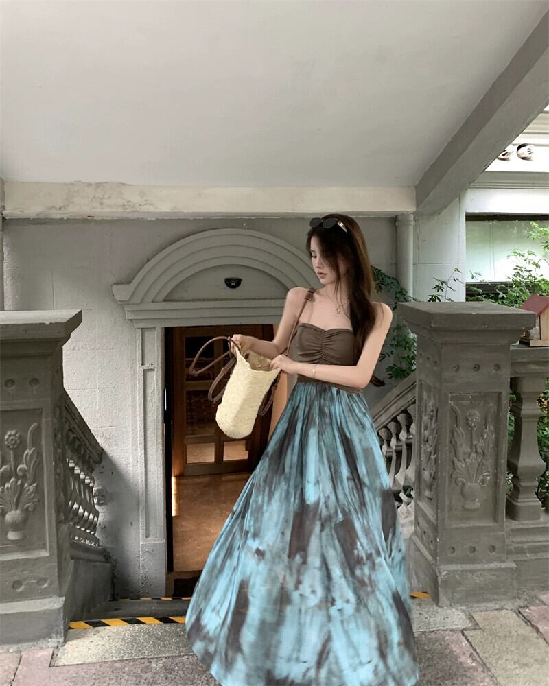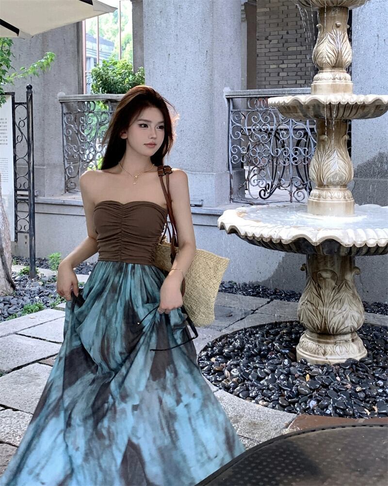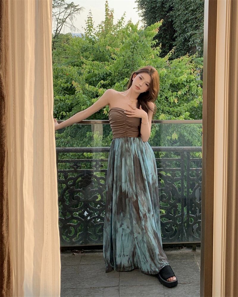 甘いワンショルダーチューブトップドレス女性の夏の 2023 新作スカートプリーツ絞り染めウエストステッチロングスカート 大人ガーリー スウィート キュート カジュアル サマー 夏物 bstraw78234929025 | beaute25