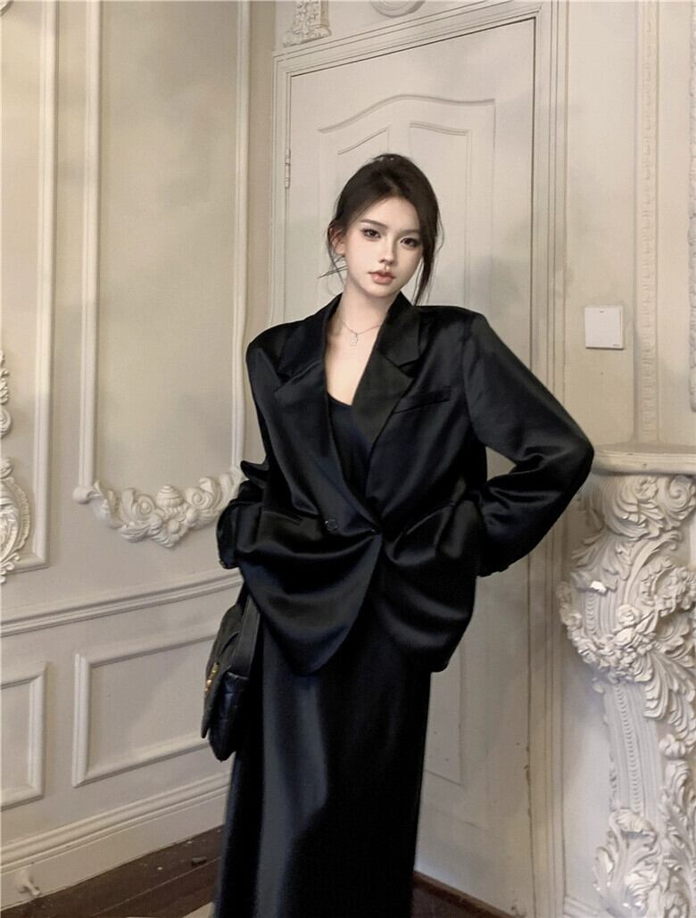 色:茶色のスカート,シャンパンライススカート,黒スカート,黒いジャケット