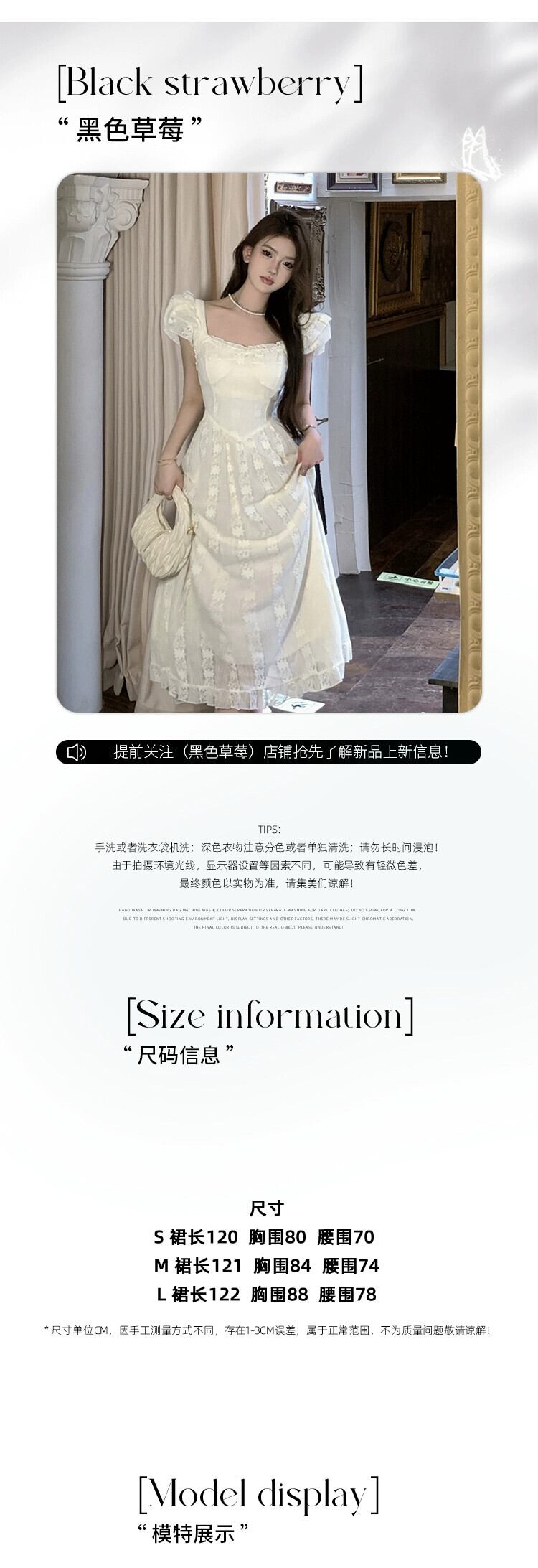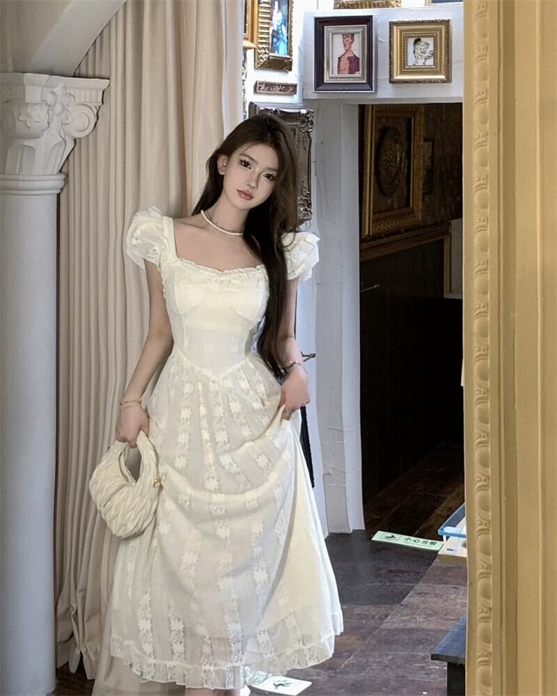 フレンチレーススクエアネックフライングスリーブドレスレディース夏ウエスト引き締め気質スカート中空菌エッジAラインロングスカート サマー 夏物 スクウェア bstraw4608965989 | beaute25