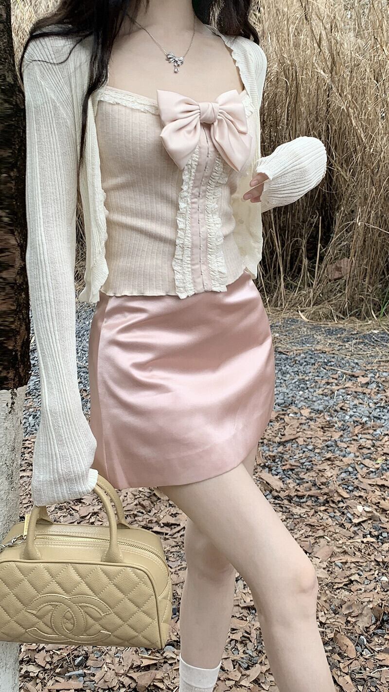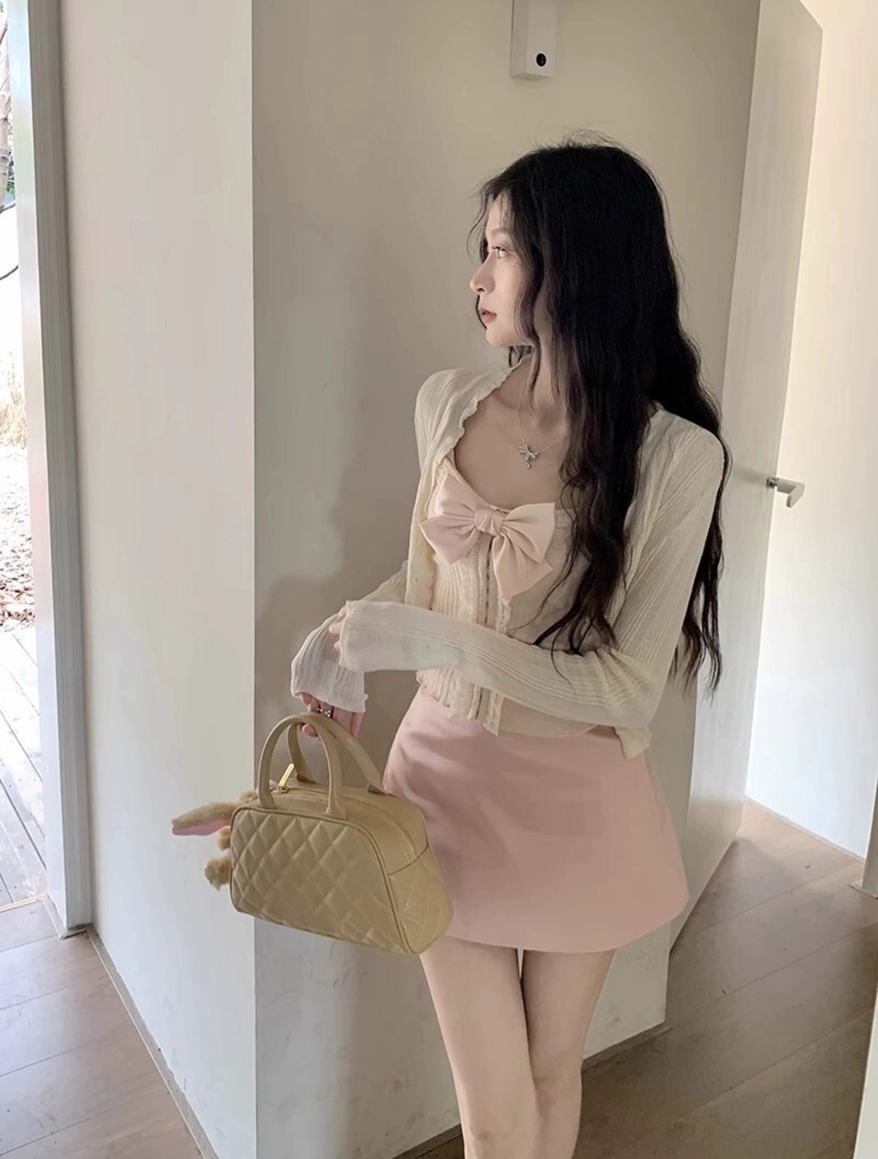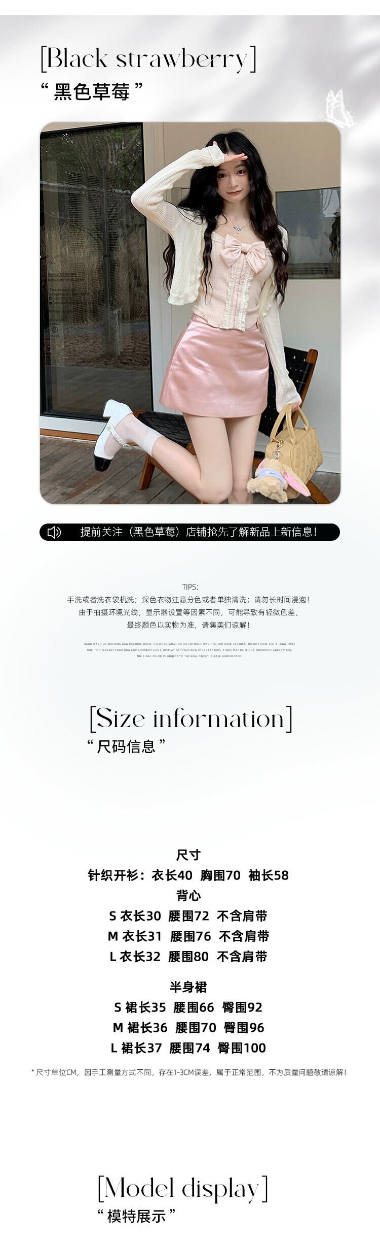 小さな甘いスーツ長袖ニットカーディガン弓キャミソール女性秋のサテンスカート 3 点セット ロング リボン 大人ガーリー スウィート キュート カジュアル オータム 秋物 bstraw58180187164 | beaute25