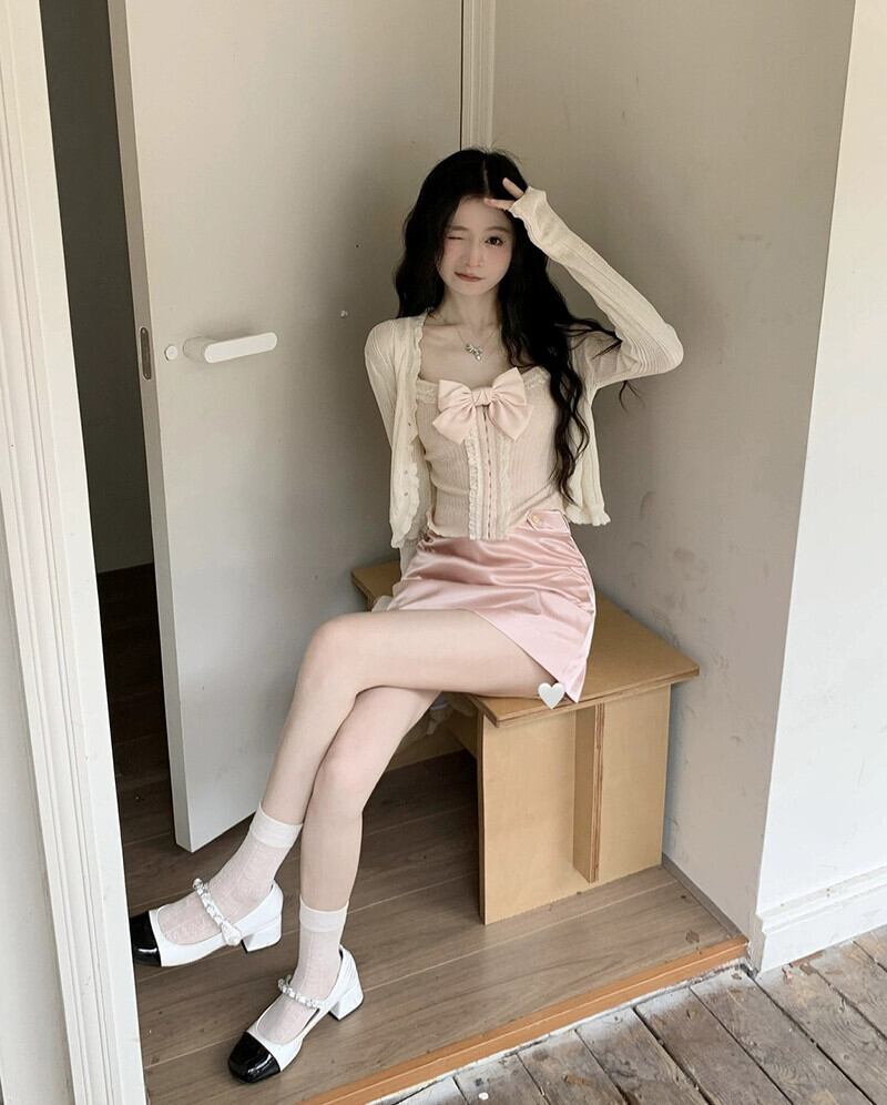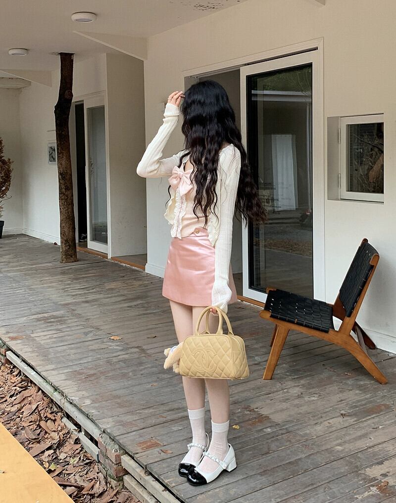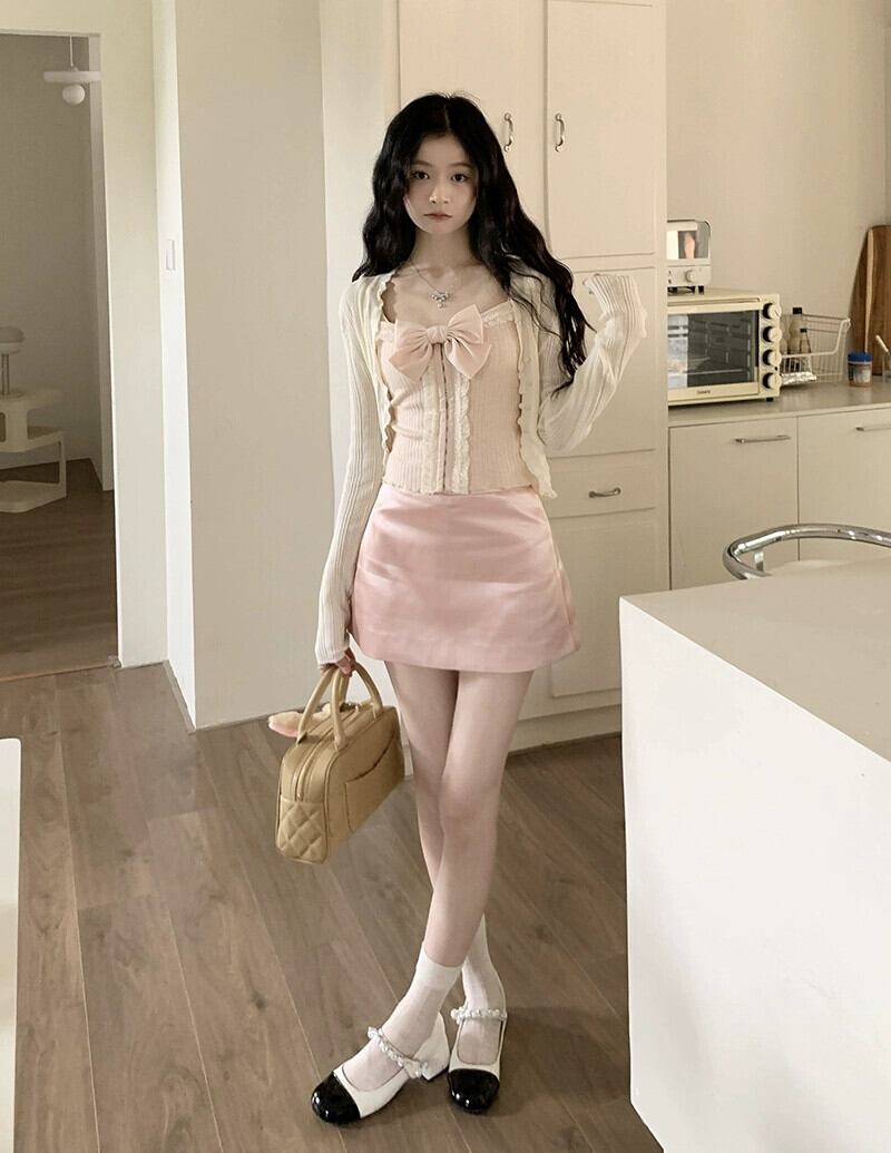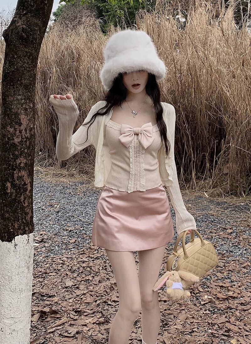 小さな甘いスーツ長袖ニットカーディガン弓キャミソール女性秋のサテンスカート 3 点セット ロング リボン 大人ガーリー スウィート キュート カジュアル オータム 秋物 bstraw58180187164 | beaute25