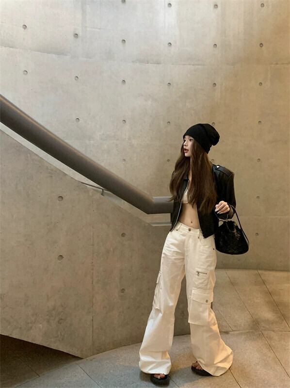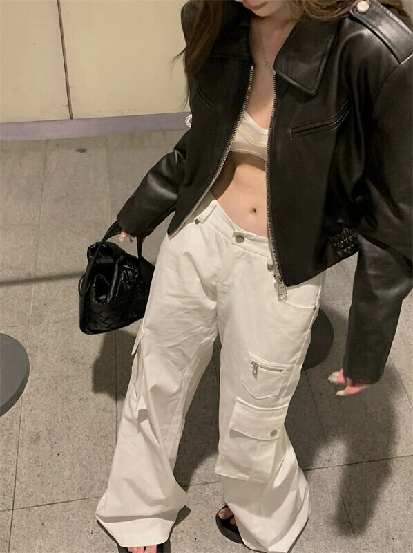 色:黒革のジャケット,白いオーバーオール,ブラウンレザージャケット