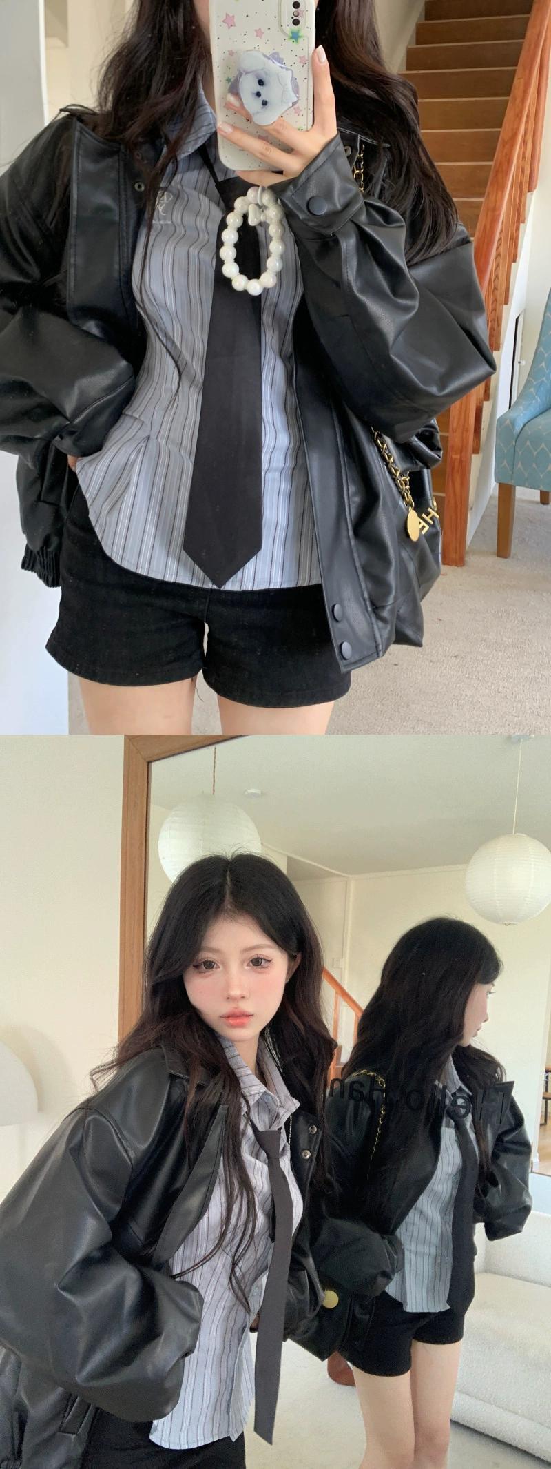 香港スタイルのレトロな Pu レザーオートバイのジャケットの女性秋の小さなルーズラペルレザージャケット黒長袖トップ ロング ブラック オータム 秋物 bstraw96923513817 | beaute25