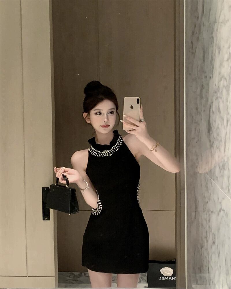 重工業ダイヤモンドがちりばめられたオフショルダーホルタードレス女性の夏の気質aラインショートスカート純粋な欲望セクシーなノースリーブリトルブラックドレス サマー 夏物 ピュア bstraw11684885201 | beaute25