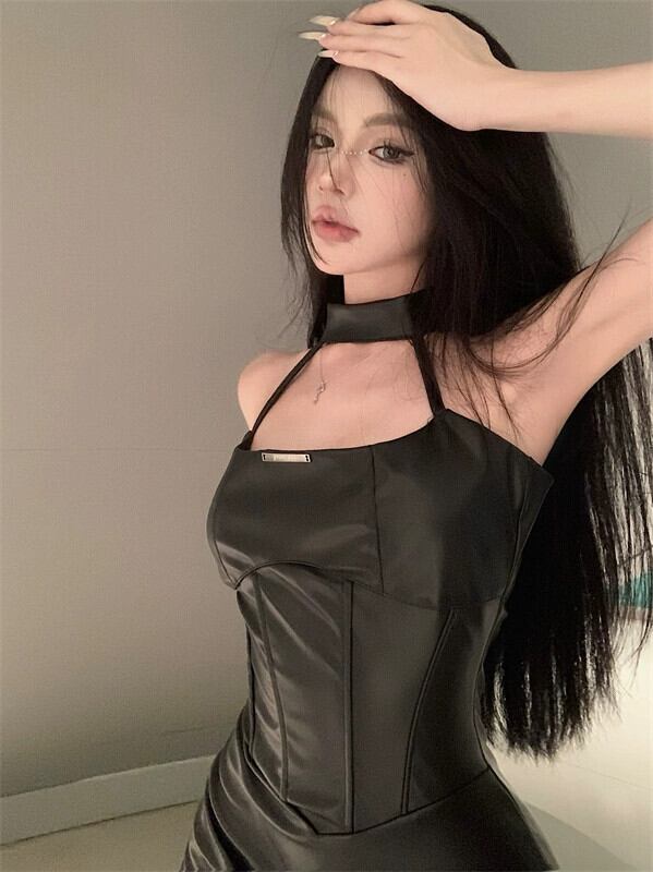 - エンドタイ ホルターネック ドレス レディース 夏 ブラック PU レザー スカート ウエスト フィッシュボーン セクシー ヒップ カバー ショート スカート サマー 夏物 bstraw18894305840 | beaute25
