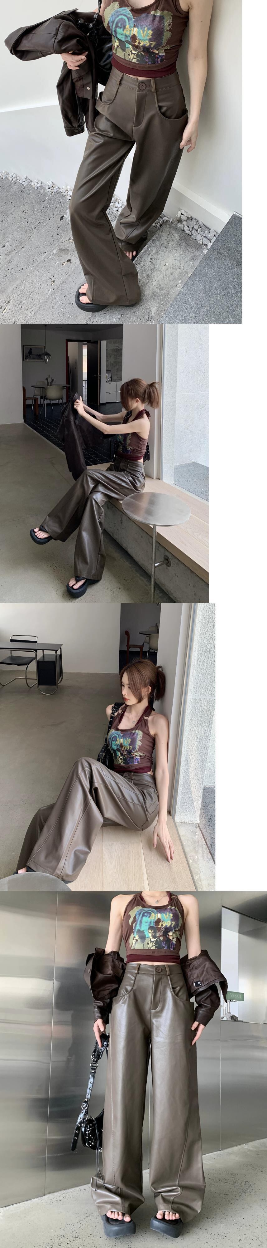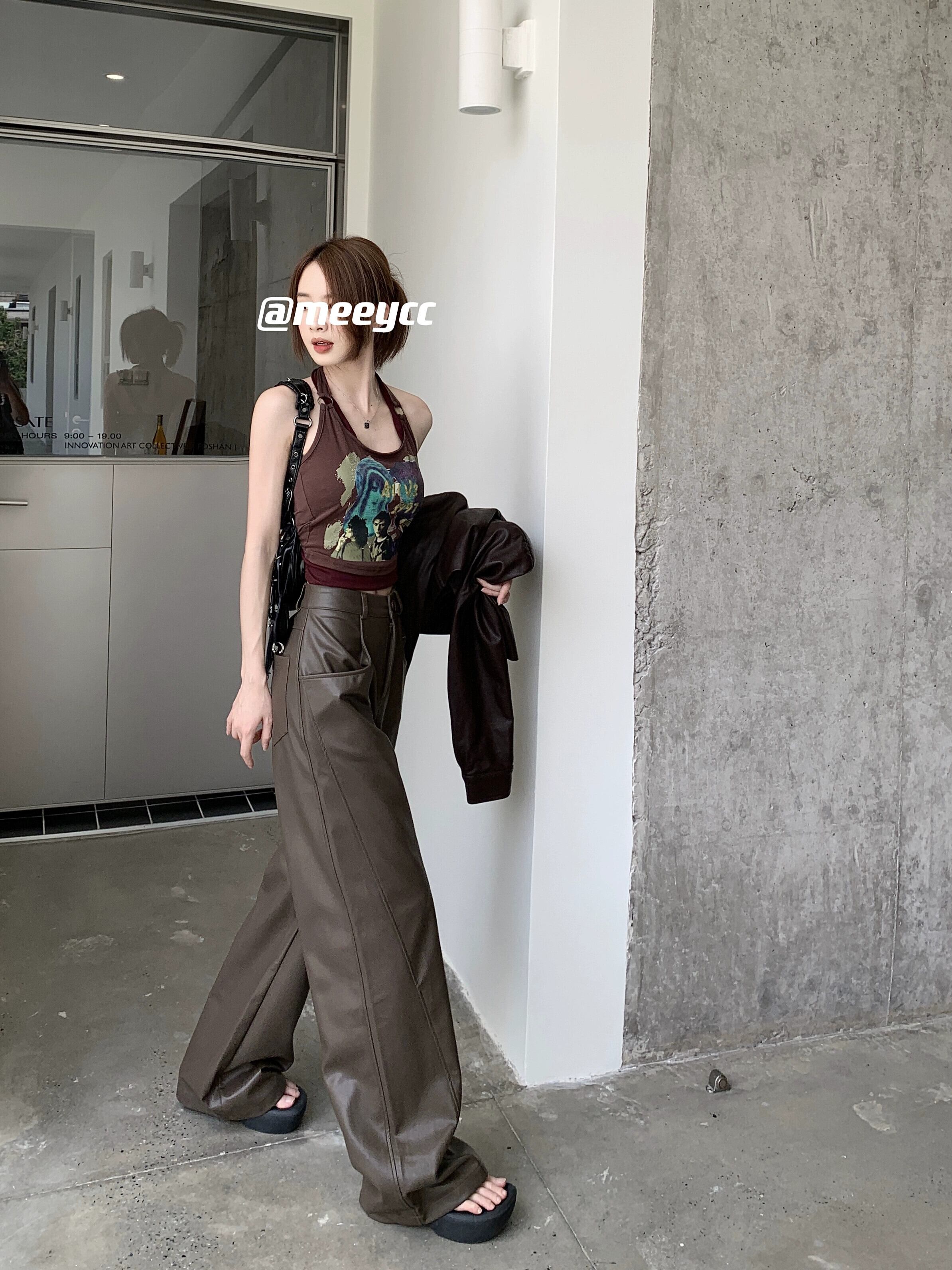 アメリカのハイストリートレザーパンツ、カジュアルパンツ、レディース秋の高級気質パンツ、ハイウエストルーズワイドレッグストレートパンツ、ズボン オータム 秋物 bstraw78391693219 | beaute25