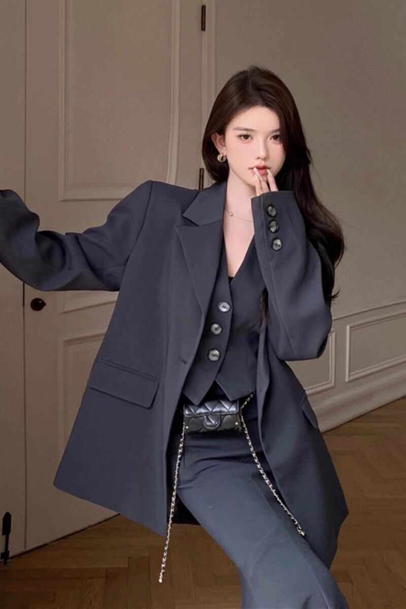 色:グレーコート,グレーのベスト,グレーのバッグヒップスカート
