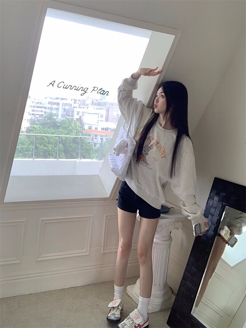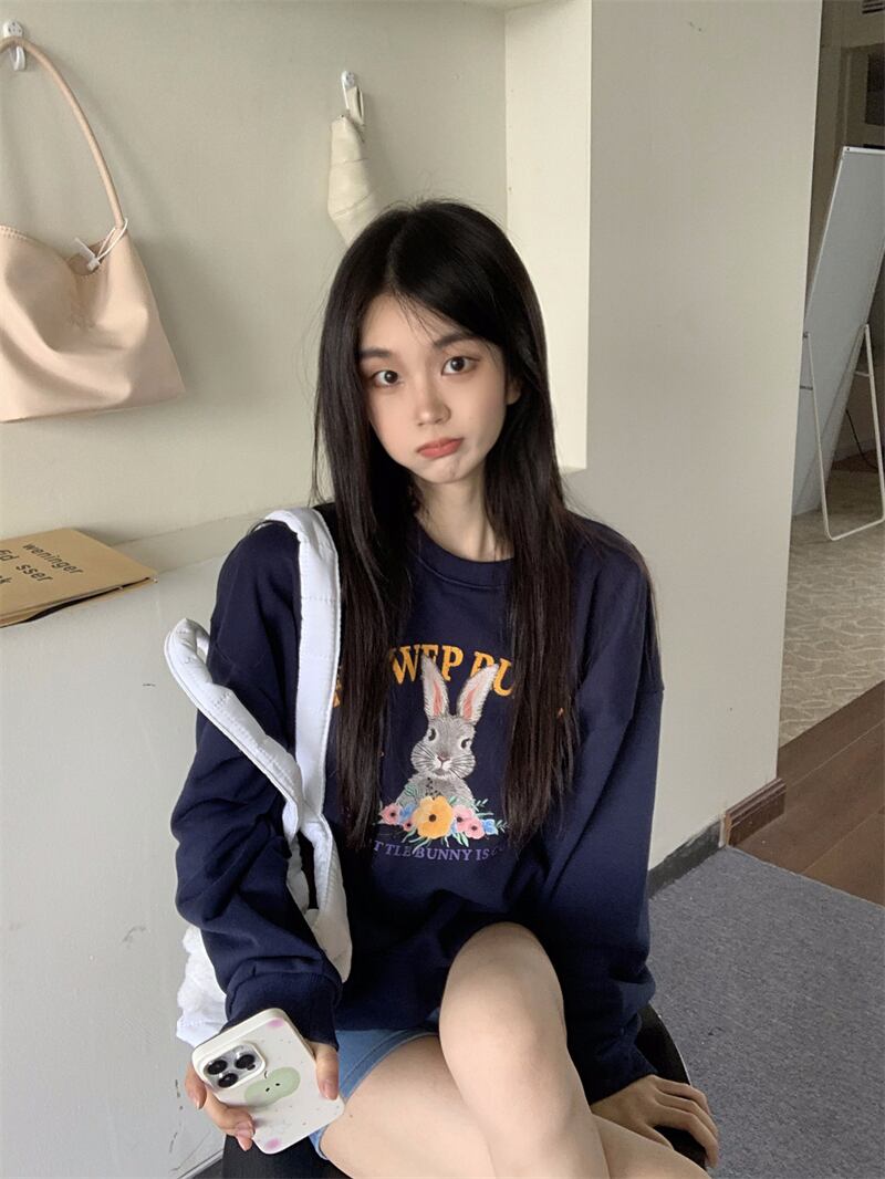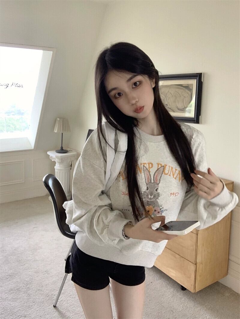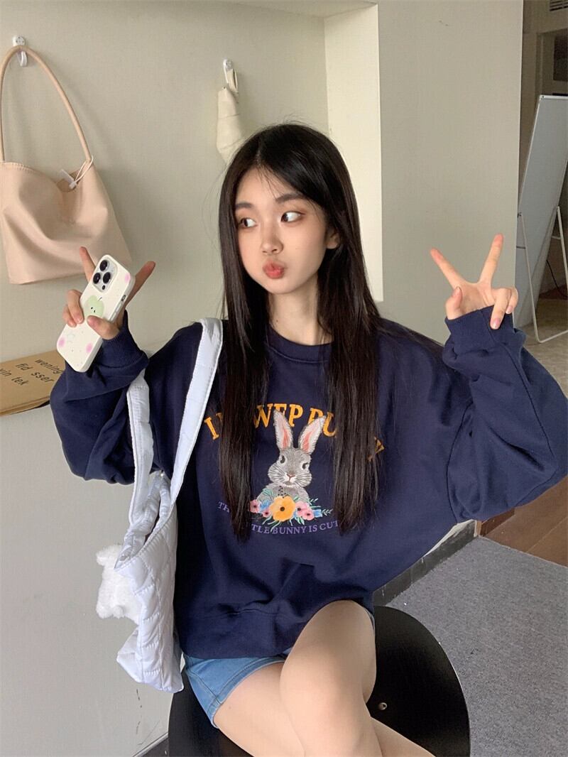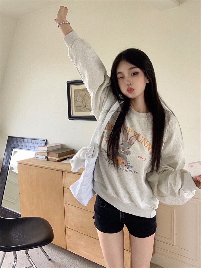 ウサギプリントグレーラウンドネックスウェットシャツ女性秋ルーズオーバーサイズ怠惰なスタイルアウターウェア長袖プルオーバートップ ロング オータム 秋物 Oネック bstraw34645687018 | beaute25