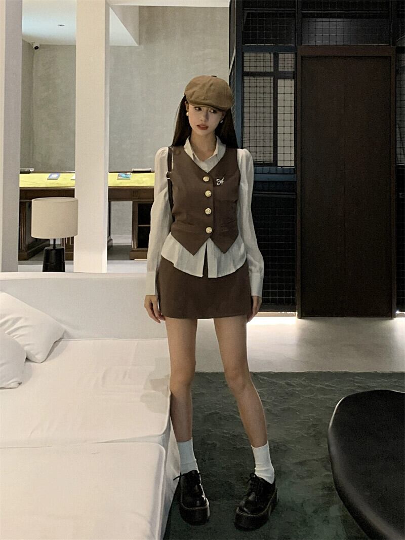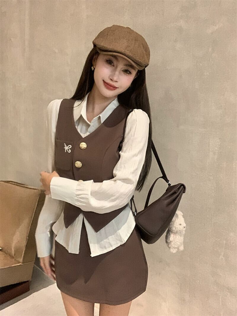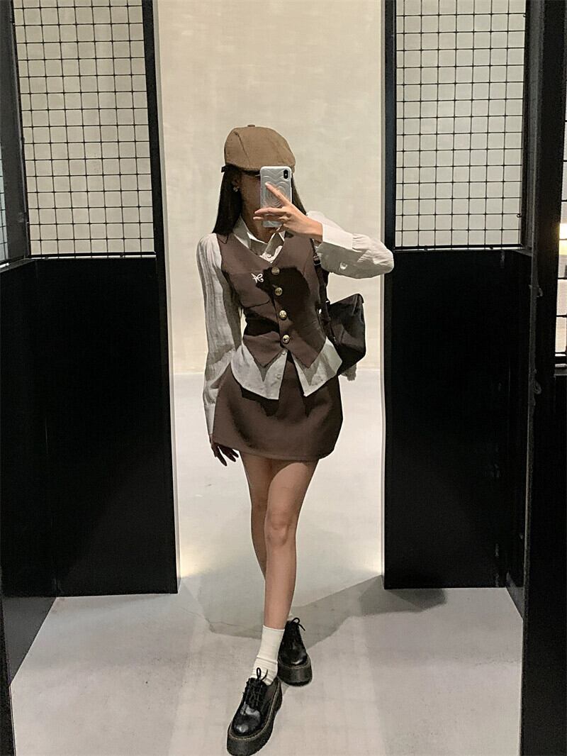 アメリカンレトロ3点セットレディース、秋カーディガンベスト、ノースリーブベスト、長袖シャツ、ハイウエストAラインスカートスーツ ロング オータム 秋物 bstraw51854764591 | beaute25