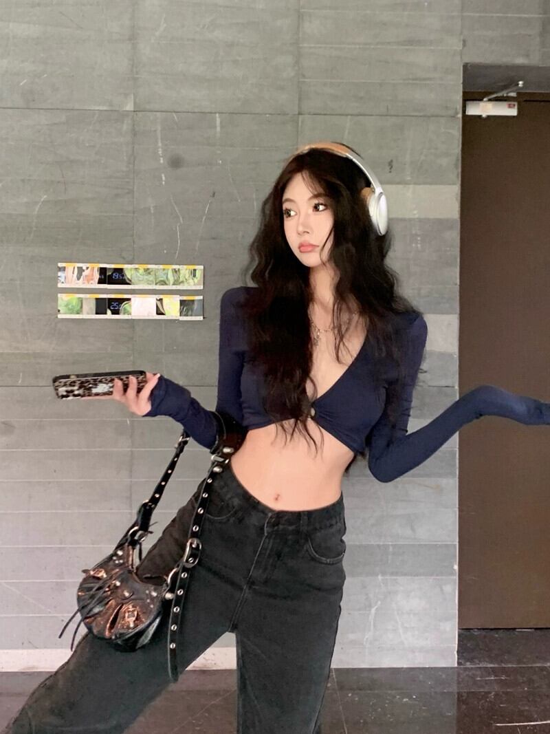 純粋な欲望ネクタイ bm スタイル v ネック長袖 tシャツ女性初秋の新セクシーなタイトなショート中空ニッチクロップトップ ロング オータム 秋物 Vネック bstraw67890471670 | beaute25