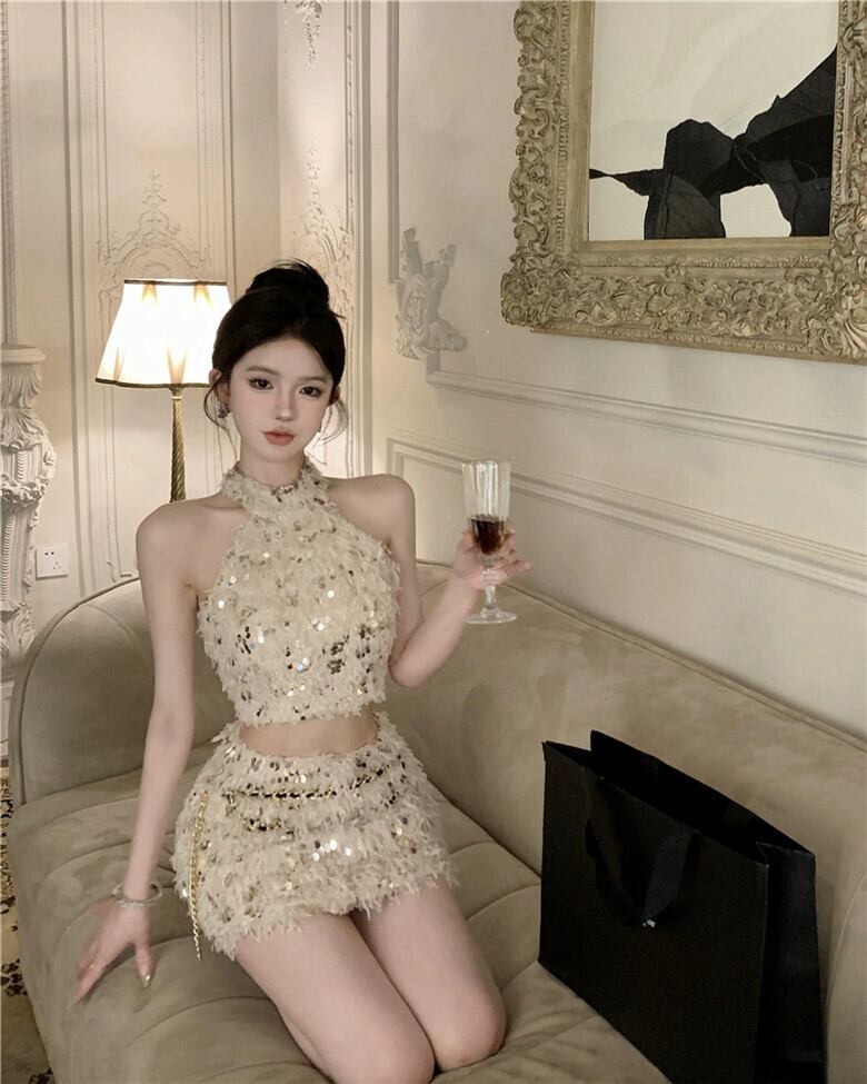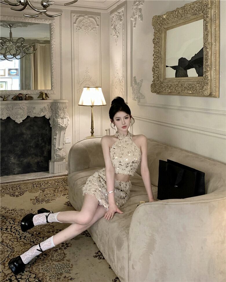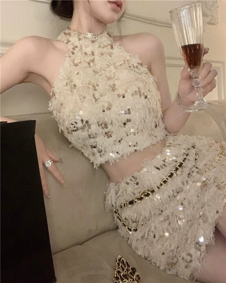 小さな香りのスタイルのスパンコール付きテルスーツフランス社交界のホルターネックキャミソール女性の夏のヒップカバースカート 2 点セット サマー 夏物 bstraw13647340814 | beaute25