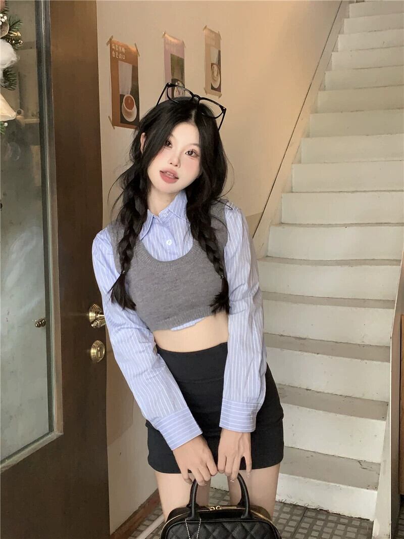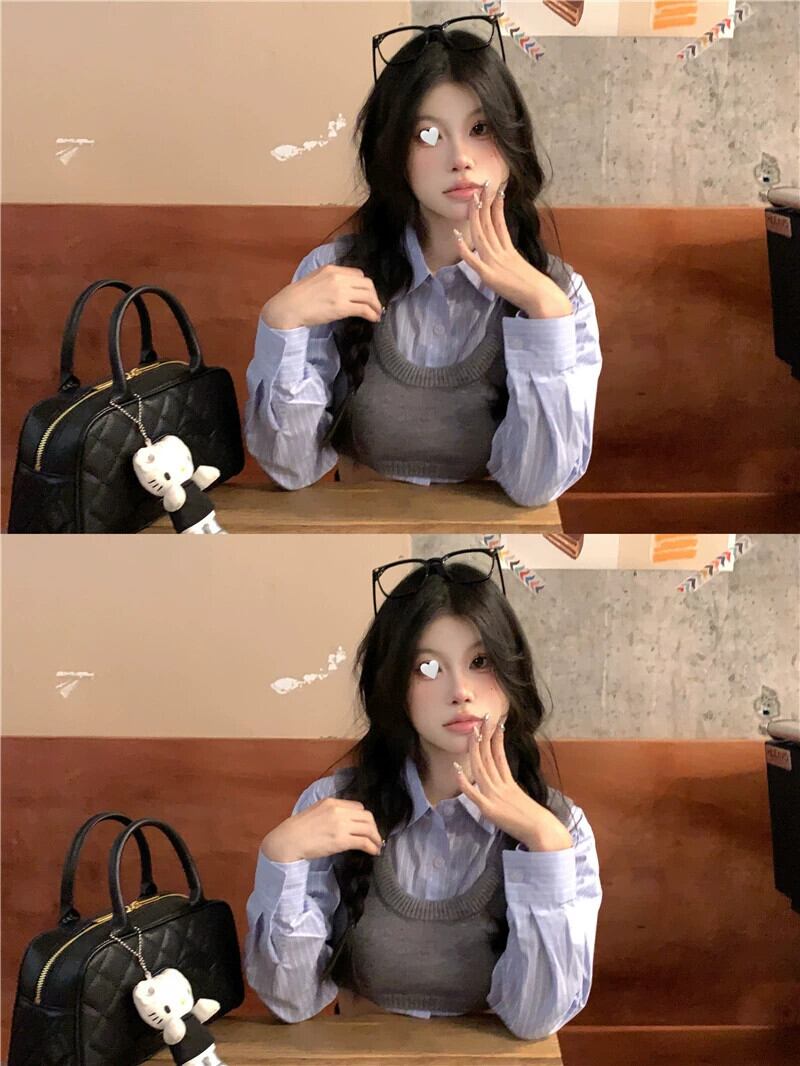 色:カーキベスト,グレーのベスト,白のシャツ,青いシャツ