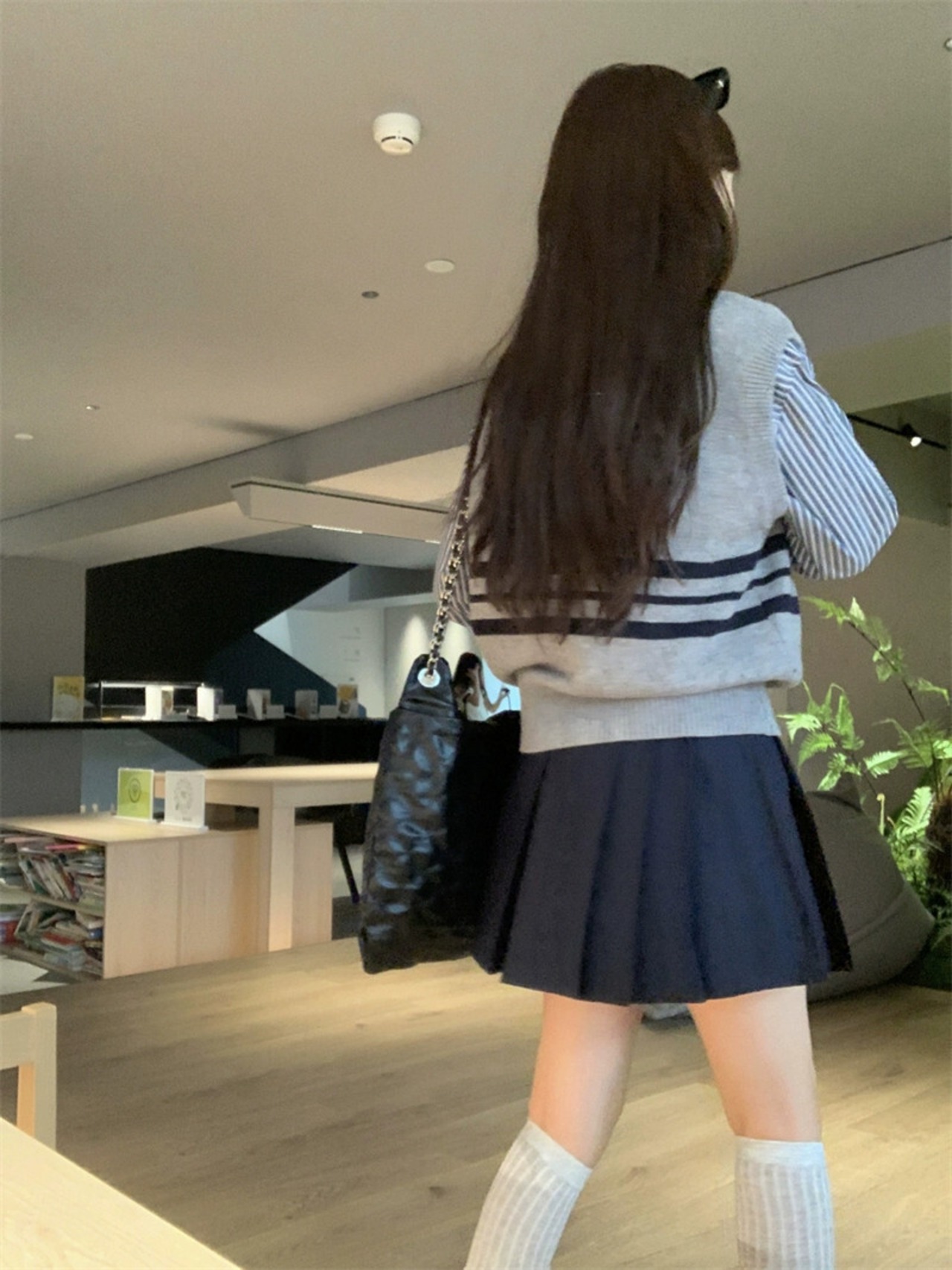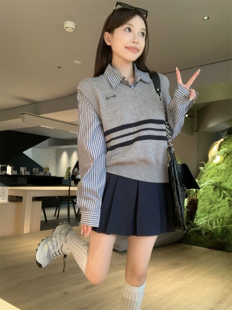 色:グレーのベスト,青いシャツ,青いスカート