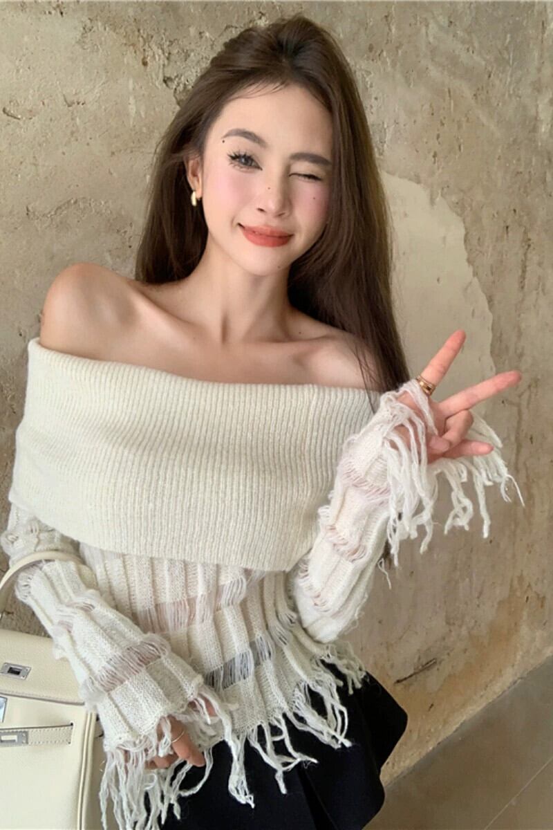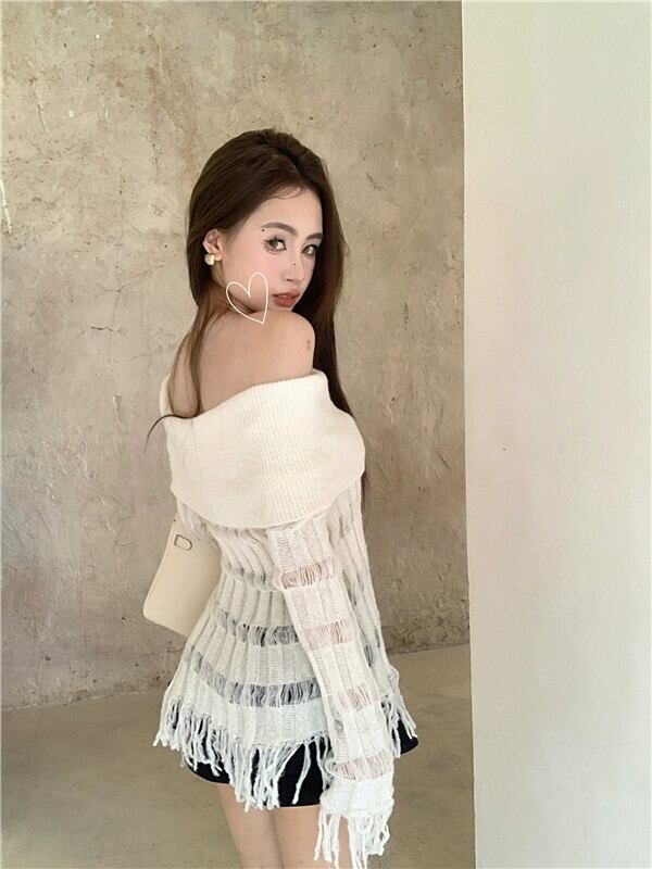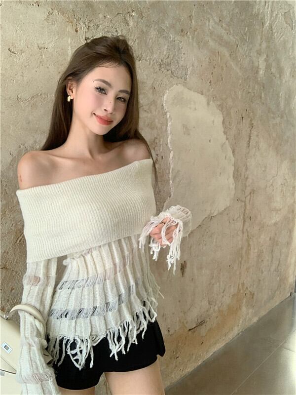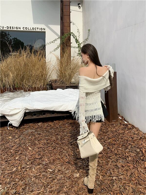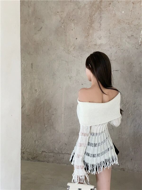 ワンショルダースリムフィットセーター女性2023年秋の新しいデザイン、フリンジ付きの気質の純粋な欲望のオフショルダー長袖トップ ロング オータム 秋物 ピュア bstraw43771993556 | beaute25