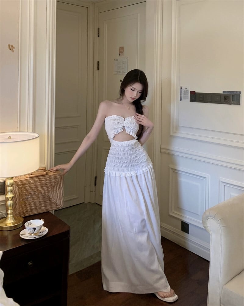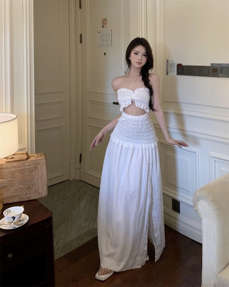 フレンチスタイル白チューブトップドレス女性の夏のノースリーブバックレス中空プリーツ A ラインスカートスリットロングスカート ホワイト サマー 夏物 Aライン bstraw86814754226 | beaute25
