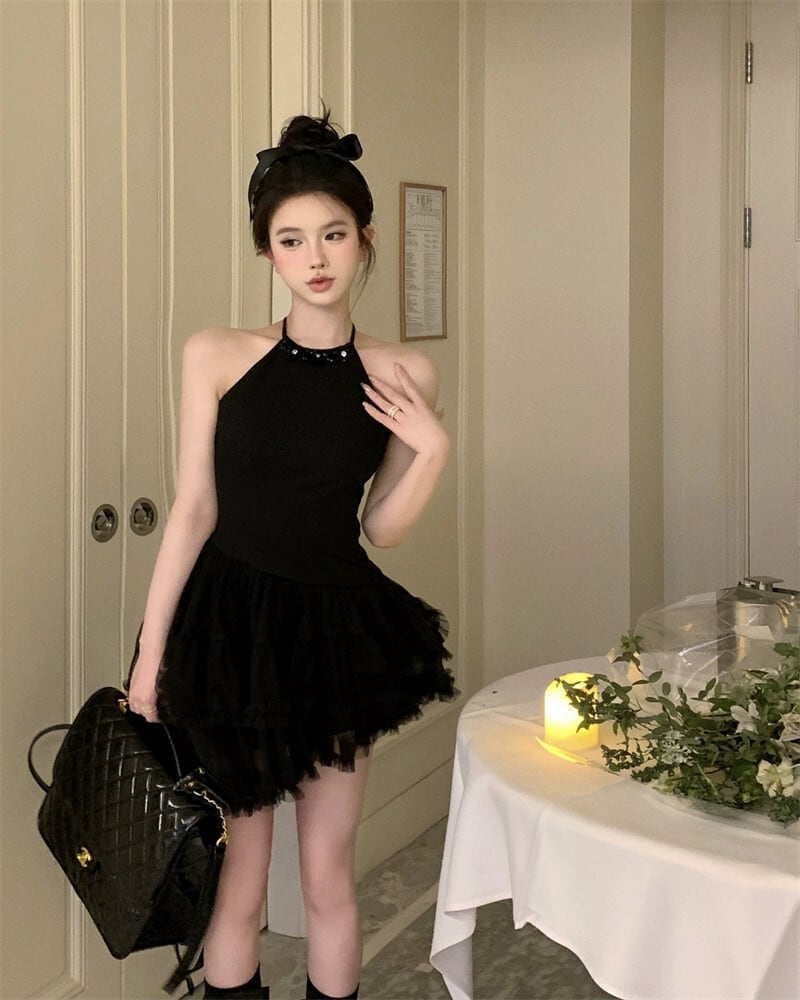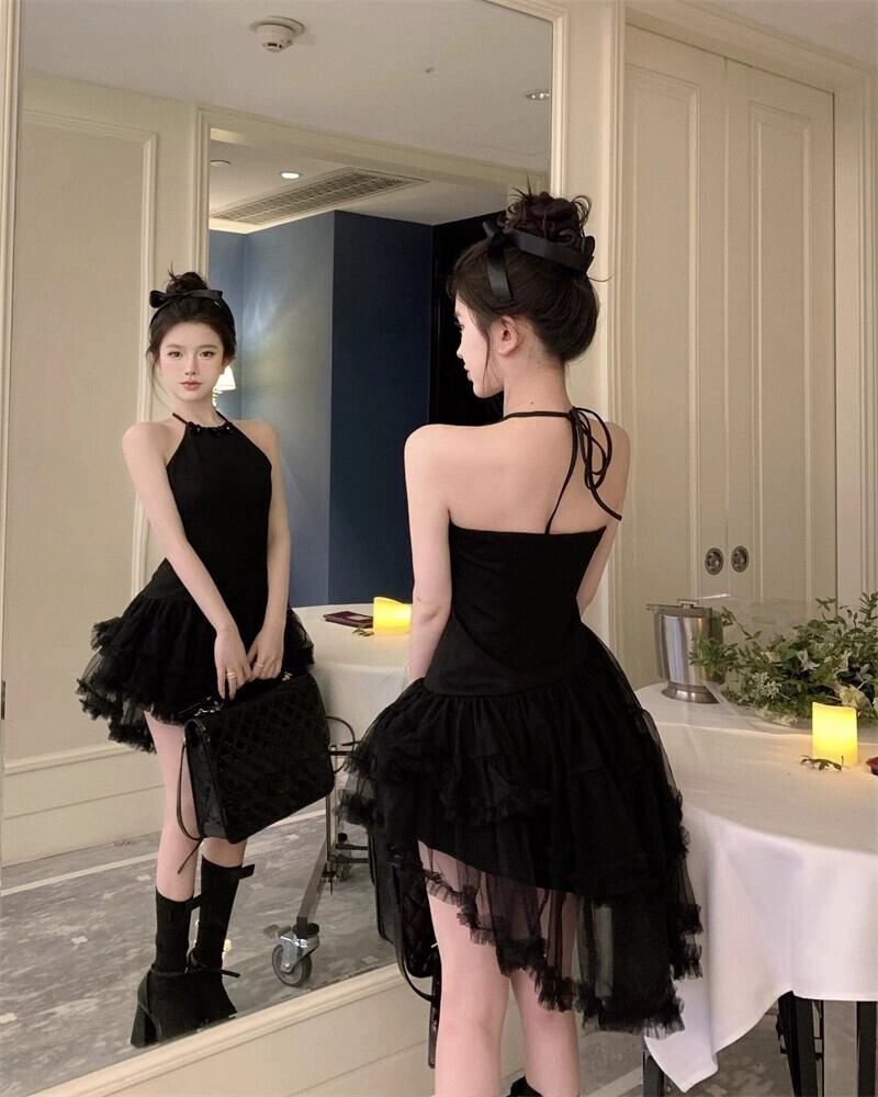 フレンチスタイルホルターネックサスペンダードレスレディースサマードレスふわふわリトルブラックドレスメッシュショートスカートイレギュラースカート 夏物 bstraw97118716326 | beaute25