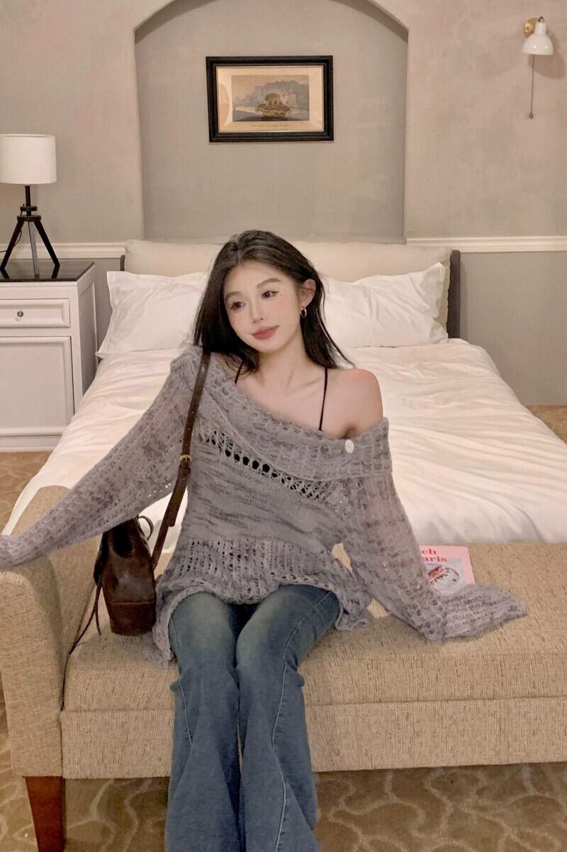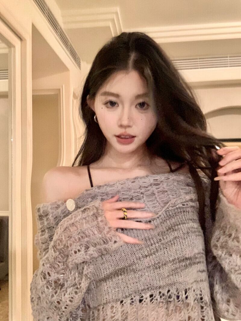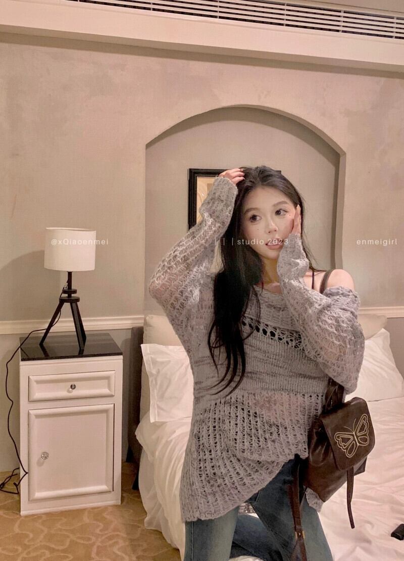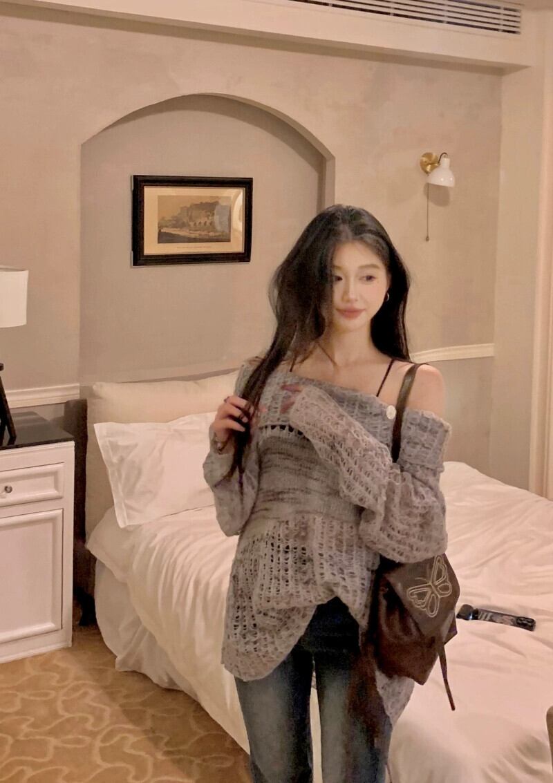 ワンショルダー中空ニットセーター女性秋のソフトでワックスのようなプルオーバーセーター、怠惰なスタイルの日焼け止め長袖ブラウストップ付き ロング オータム 秋物 bstraw32298368430 | beaute25