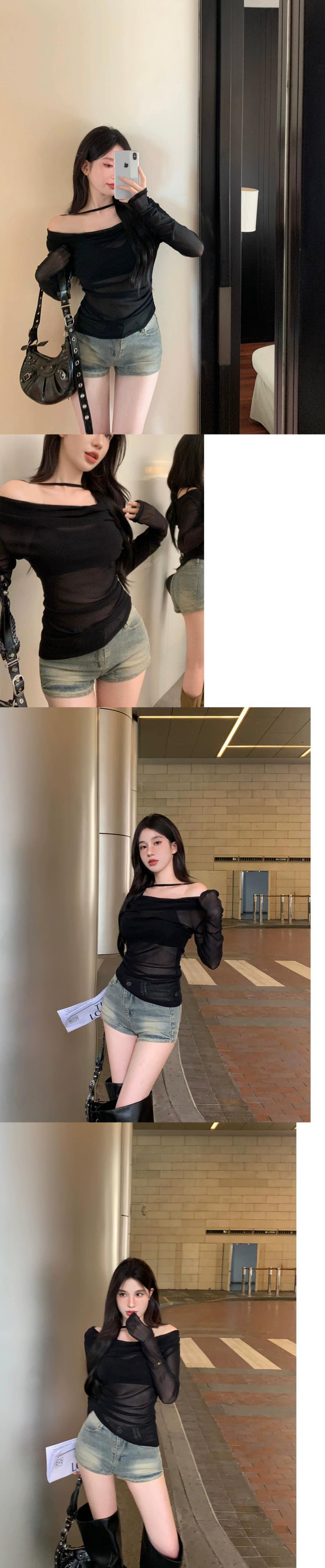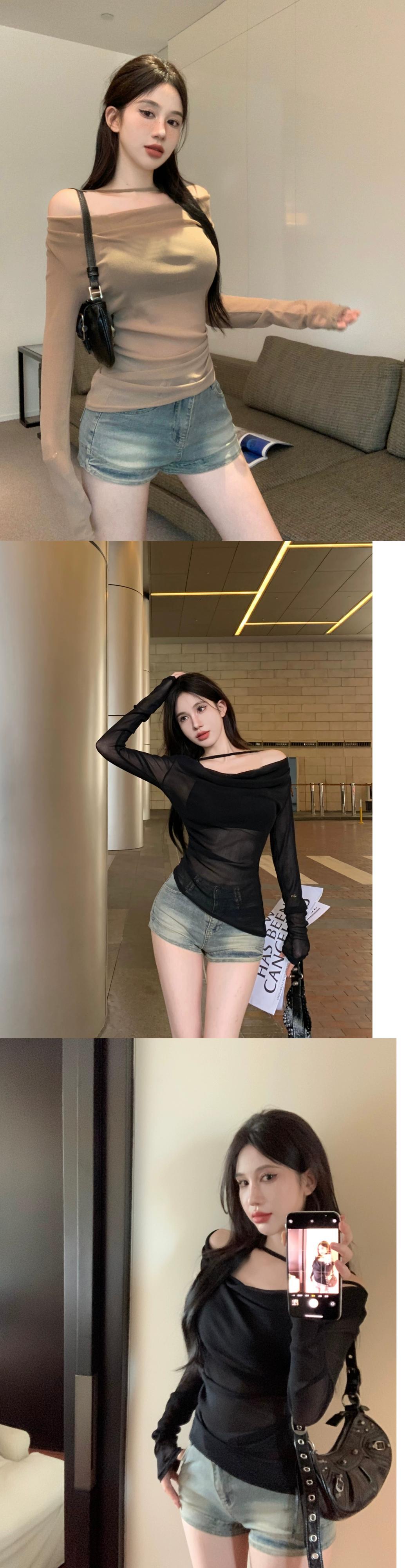 ワンショルダー長袖メッシュ Tシャツ女性 2023 秋の新純粋な欲望スリムフィット日焼け止めブラウスシースルートップ ロング オータム 秋物 ピュア bstraw17136791518 | beaute25