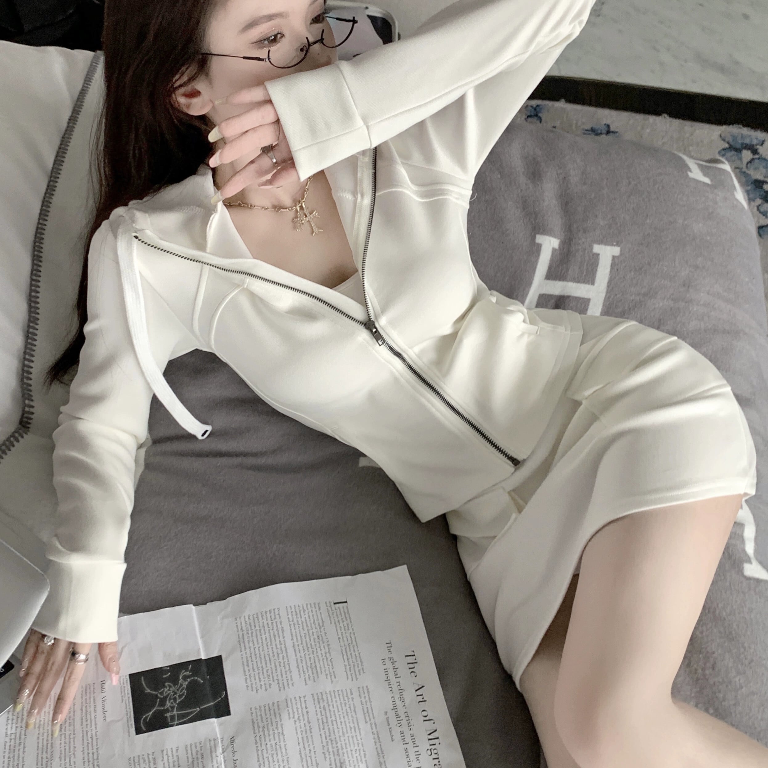 スポーツスタイルスーツ長袖フード付きカーディガンコートトップレディース秋ヒップカバースカート白 2 点セット ロング ホワイト オータム 秋物 bstraw15815422410 | beaute25