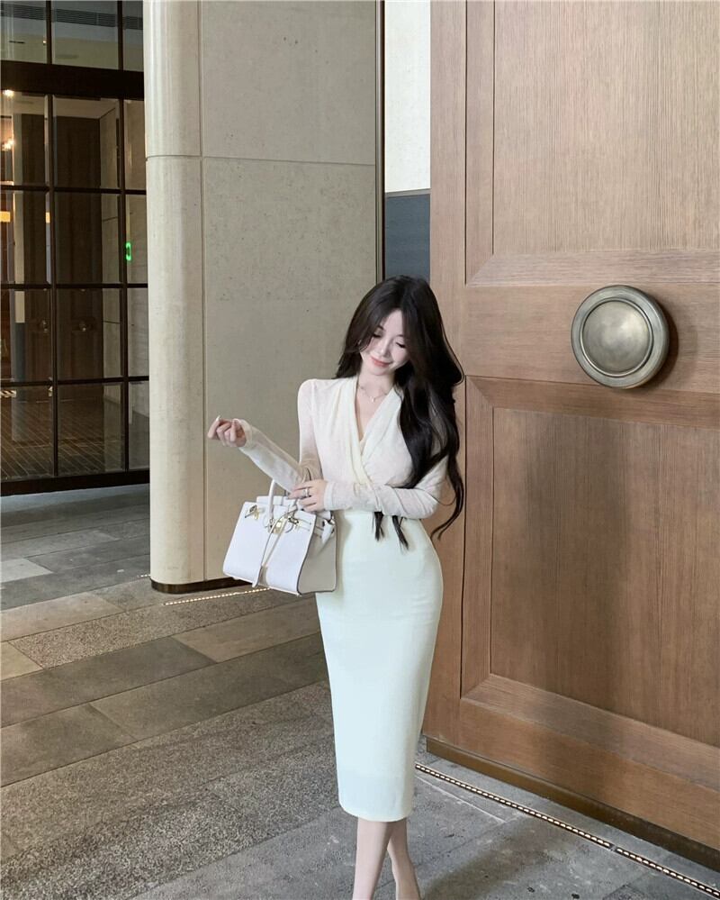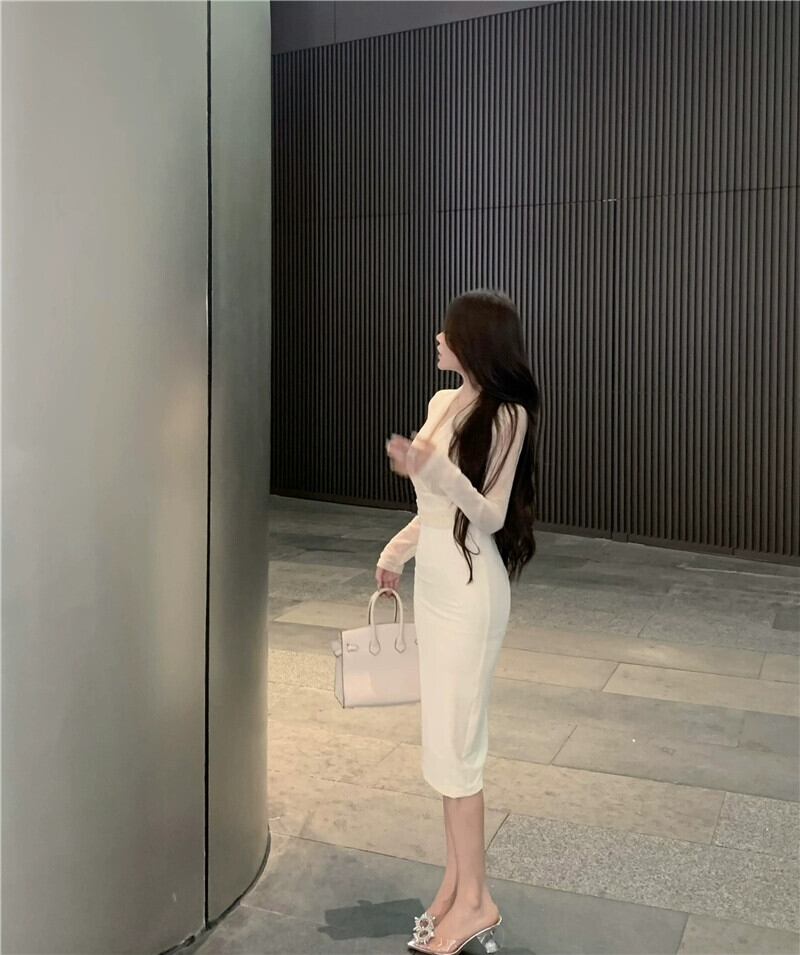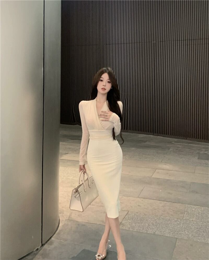 エレガントな長袖Vネックドレスの女性。秋のメッシュスプライシングスカート、ウエストとセクシーなヒップ抱きのミドル丈スカート。 ロング オータム 秋物 bstraw18499256503 | beaute25