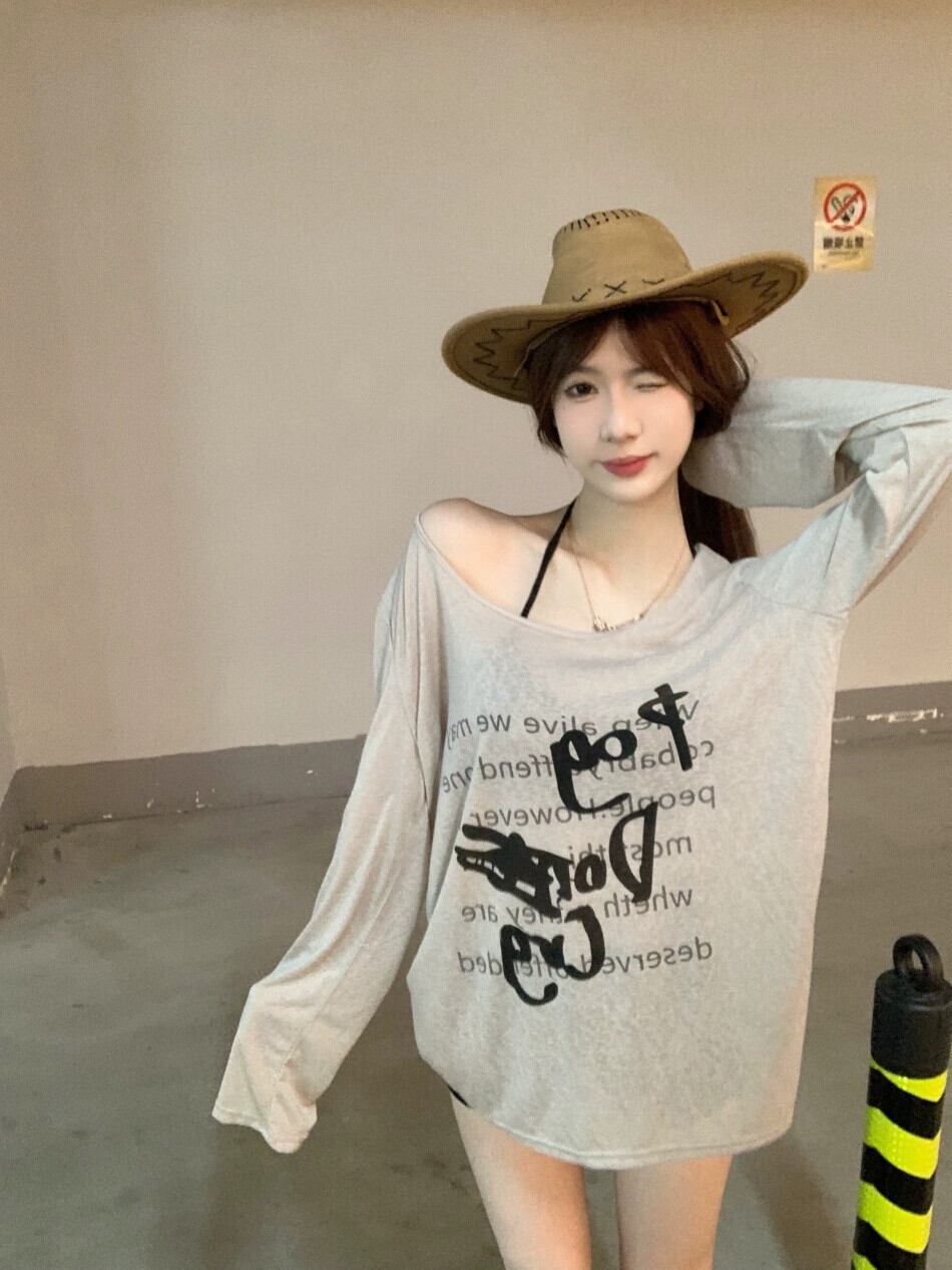 大きなネックラインのプリント長袖日焼け止めブラウス Tシャツ女性秋薄いルーズミッドレングスデザイン傾斜ショルダートップ ロング オータム 秋物 bstraw90047321350 | beaute25