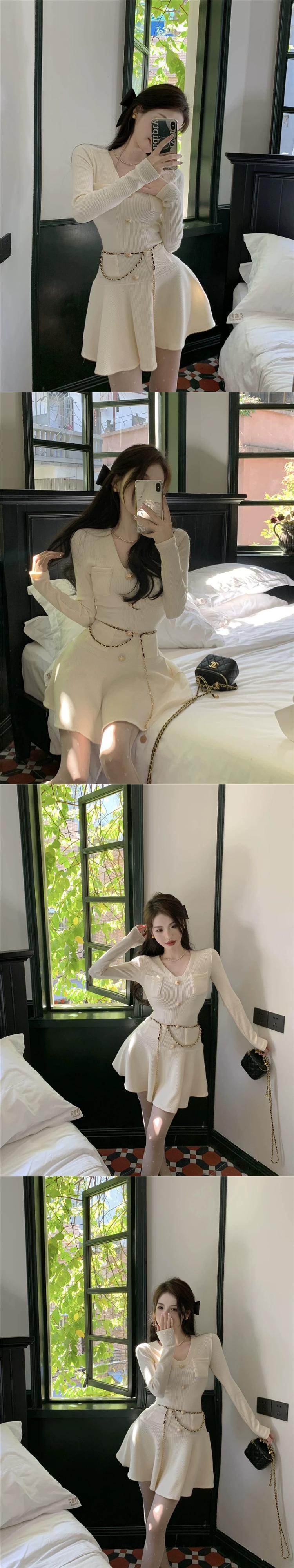 V ネック気質ニットドレス女性の秋長袖スリムフランス純粋な欲望セクシーなスカートウエスト A ラインショートスカート ロング オータム 秋物 Vネック Aライン ピュア bstraw27788538816 | beaute25