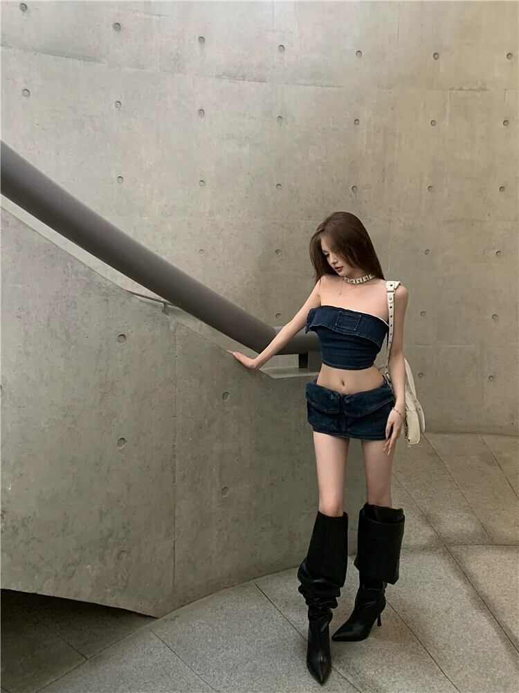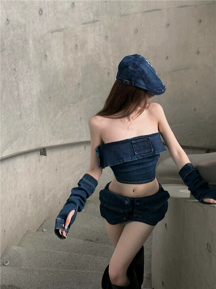 アメリカンレトロデニムスーツ甘いネクタイチューブトップベスト女性の夏のセクシーなヒップカバースカートツーピースセット 大人ガーリー スウィート キュート カジュアル サマー 夏物 bstraw49624509514 | beaute25
