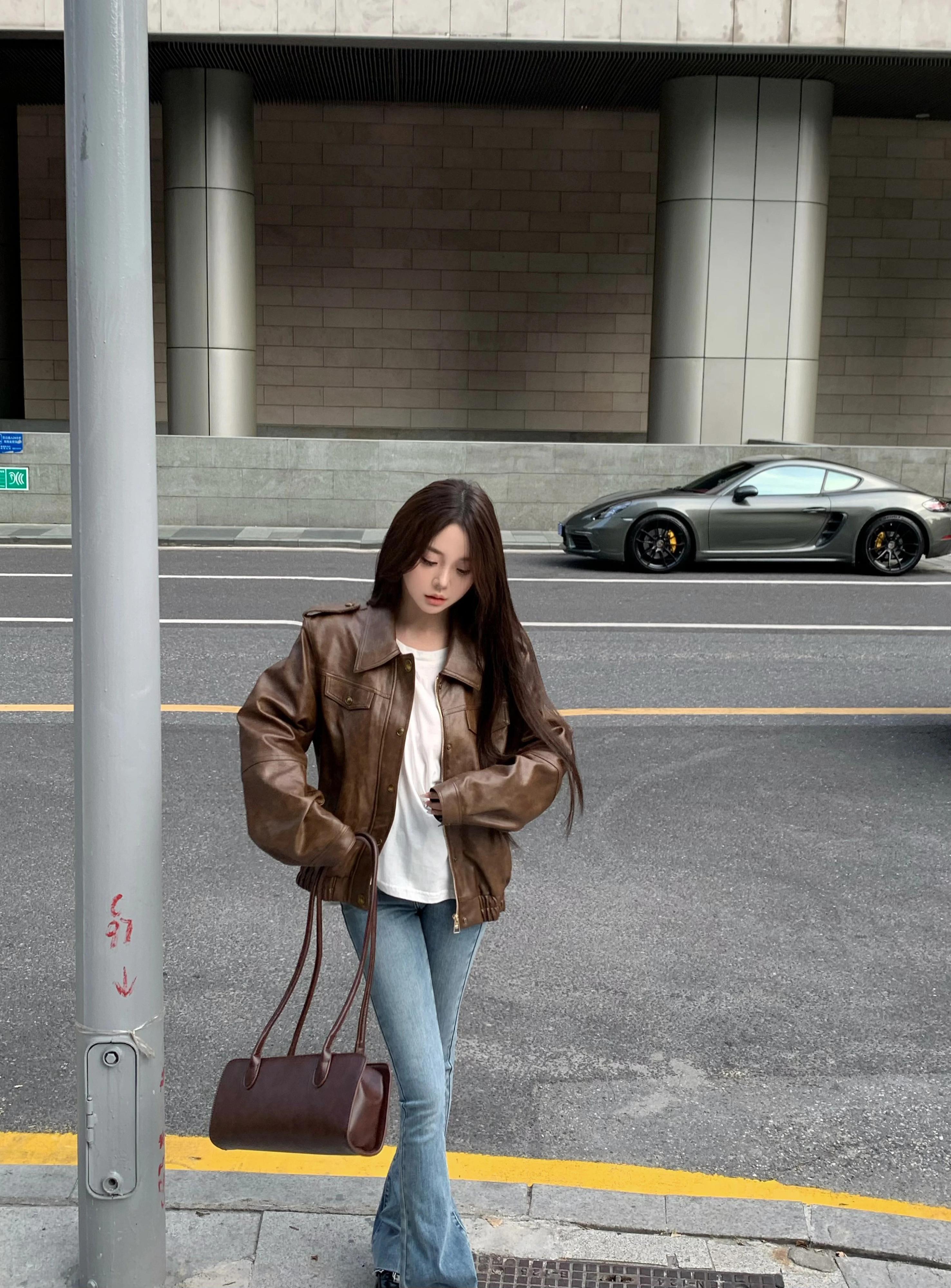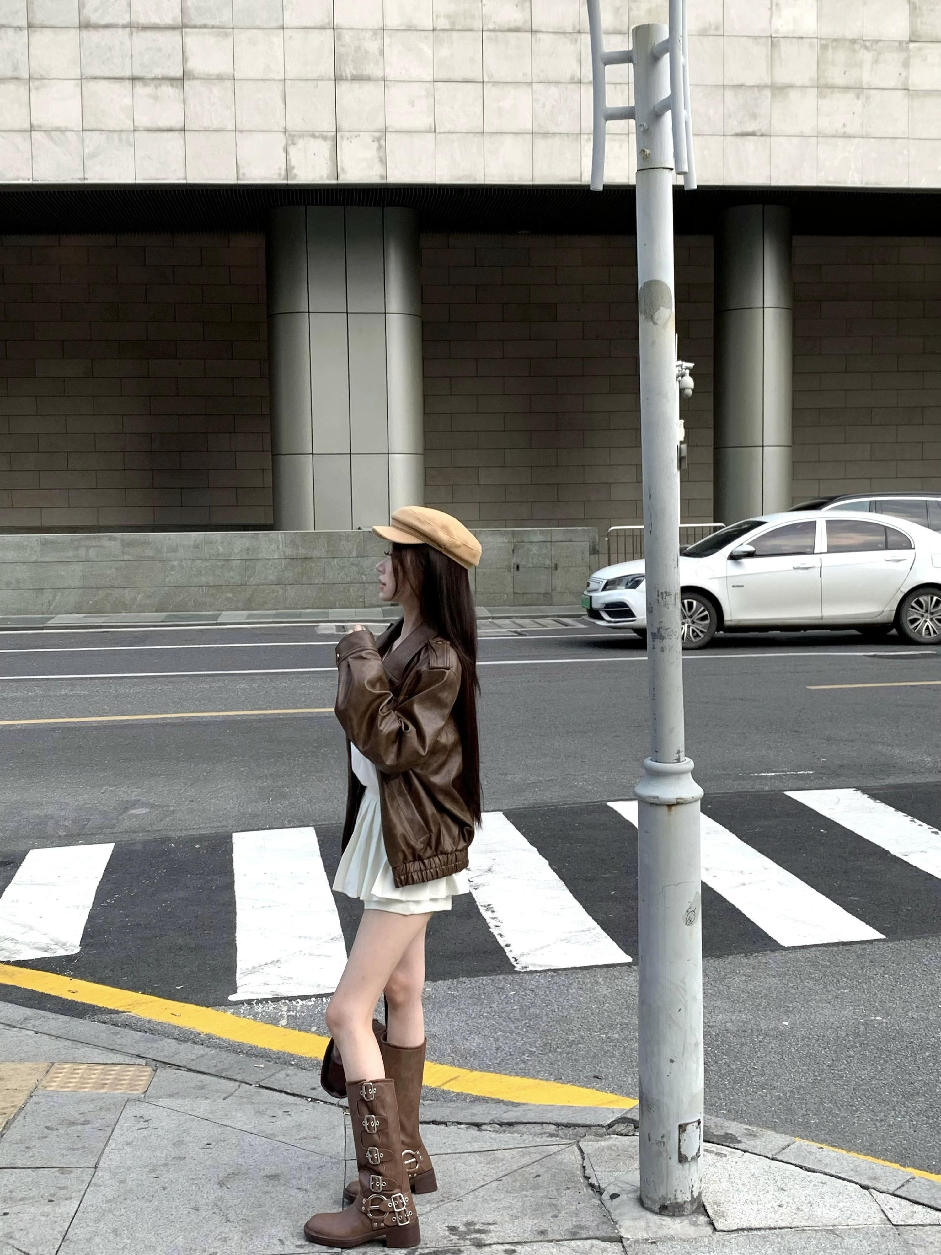 レトロブラウン pu レザー長袖ジャケットの女性の秋 2023 新しいスタイルのハイエンドの気質レザーオートバイのジャケットトップ ロング オータム 秋物 bstraw55129831840 | beaute25
